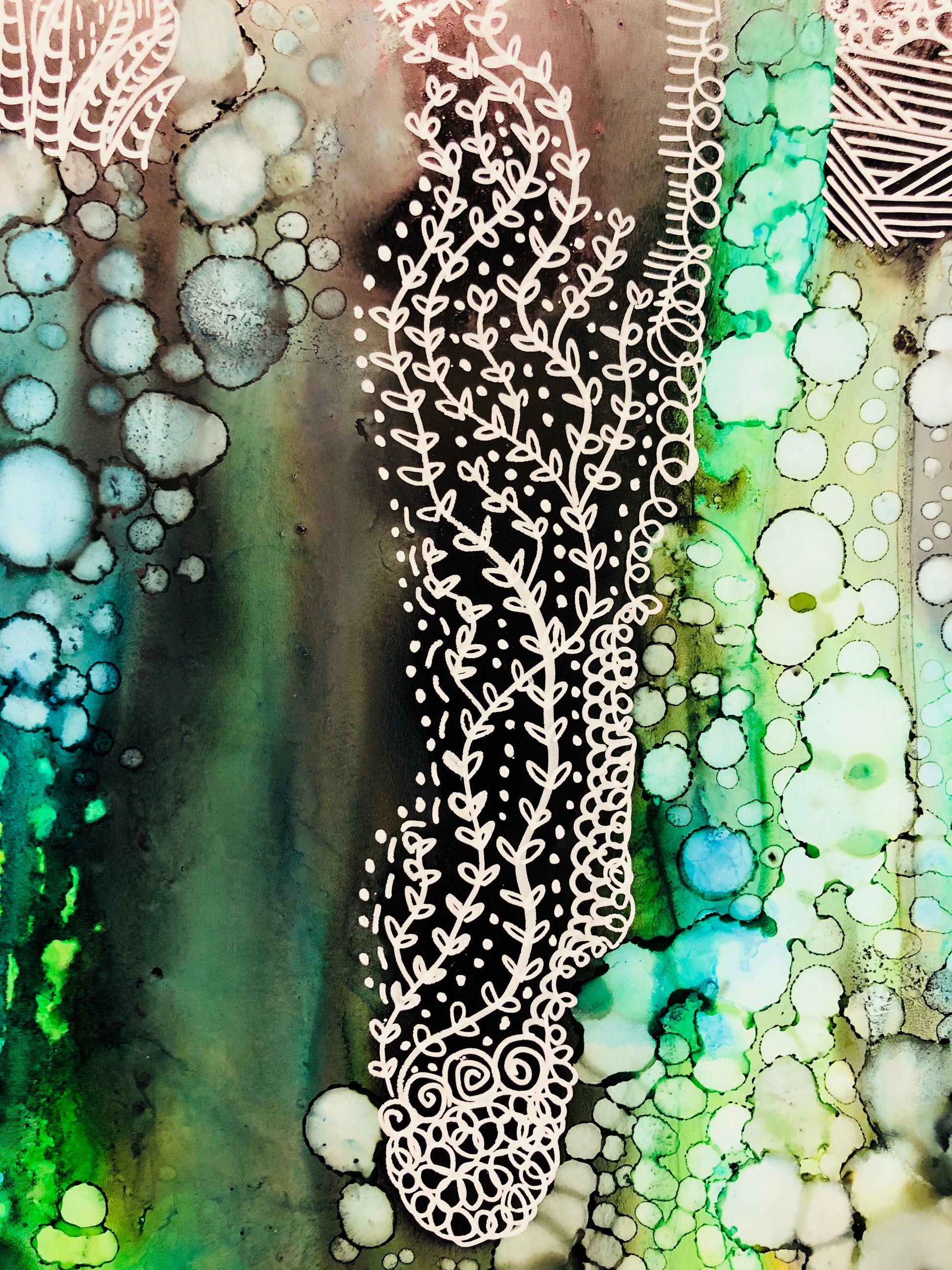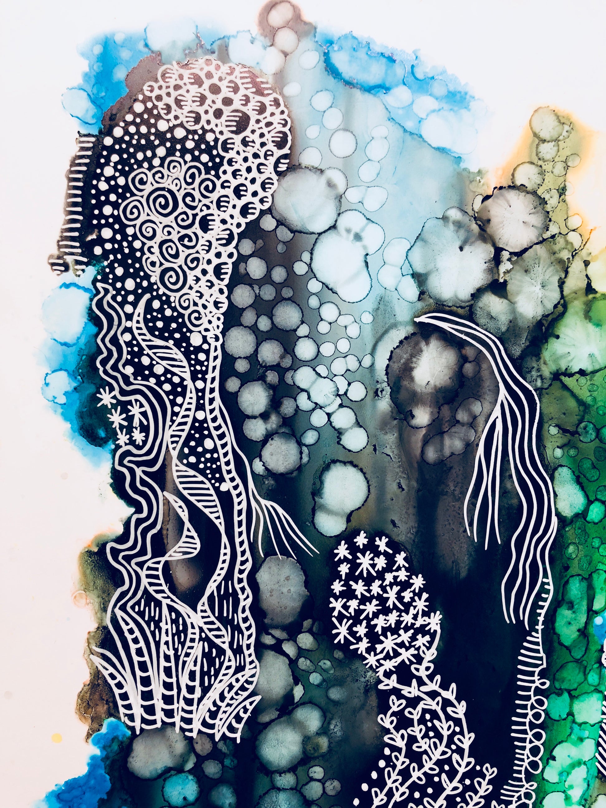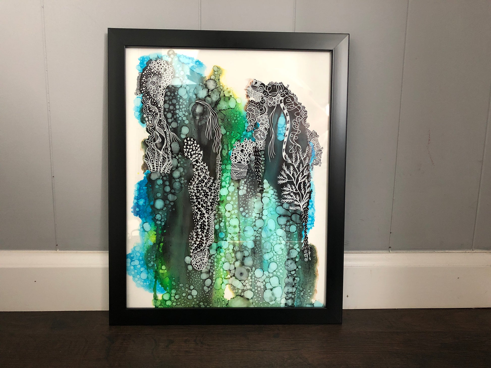 11” x 14” Framed piece of art done with alcohol inks and pen/ink on yupo paper.