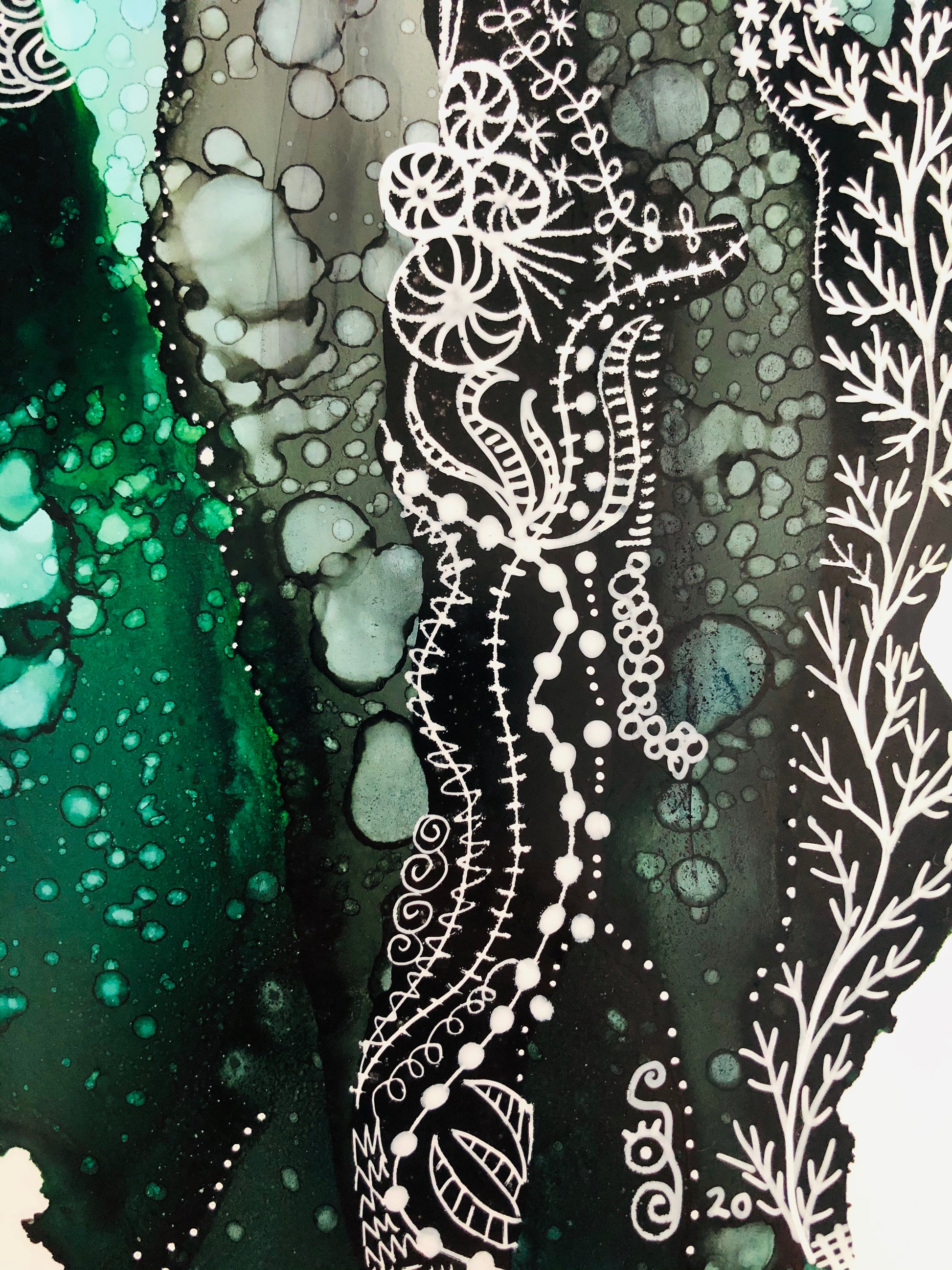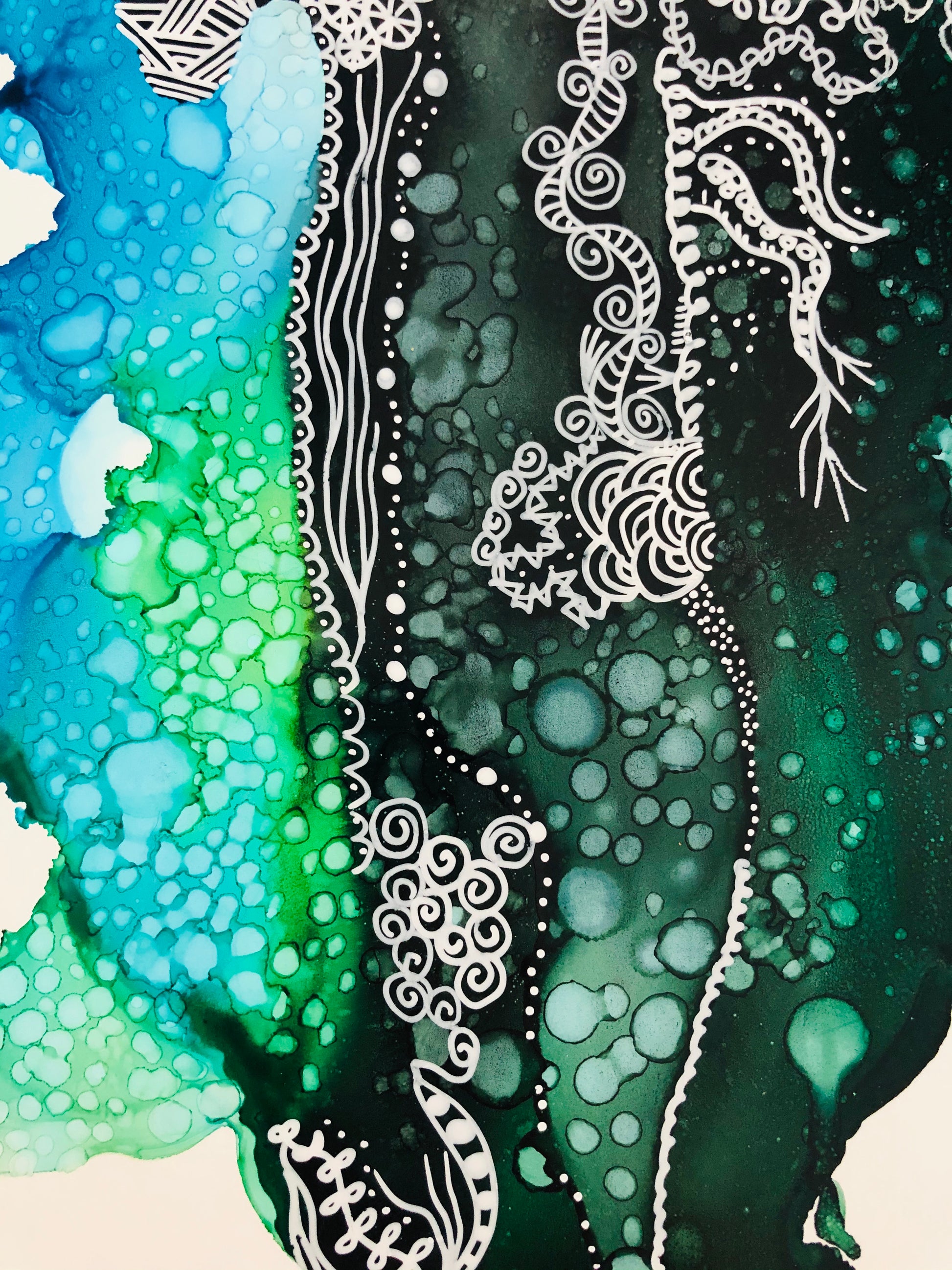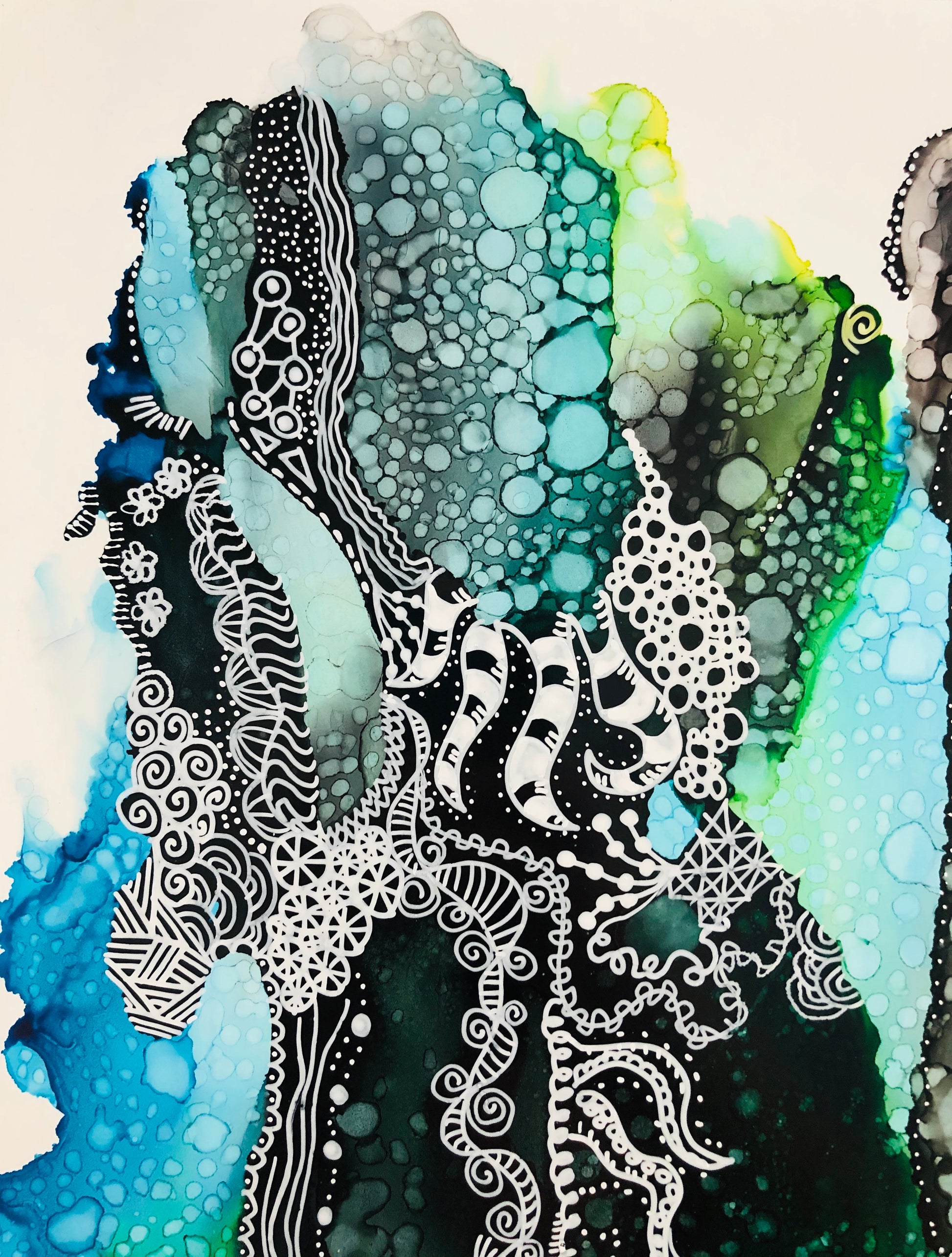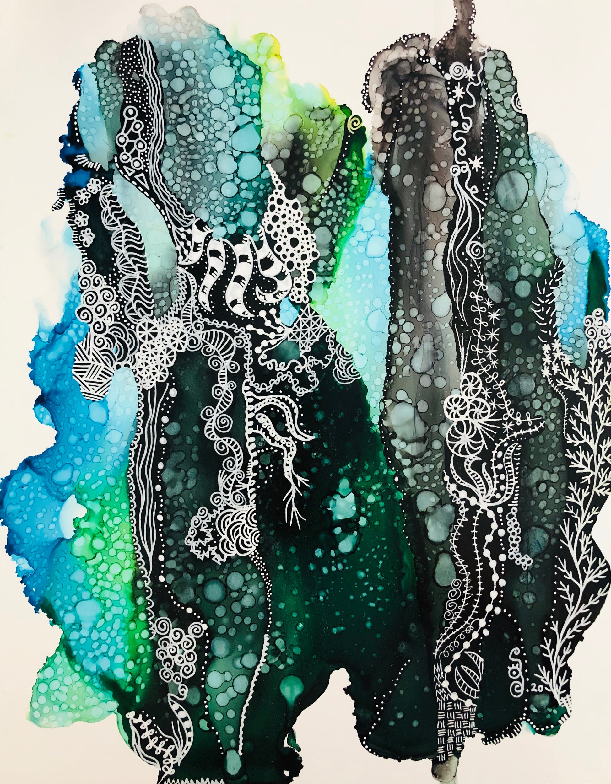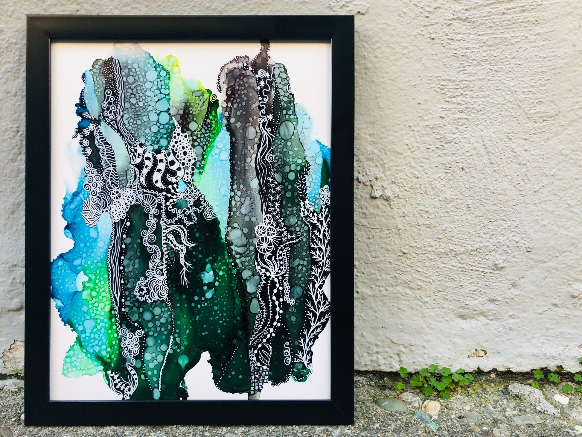 11” x 14” Framed piece of art done with alcohol inks and pen/ink on yupo paper.
