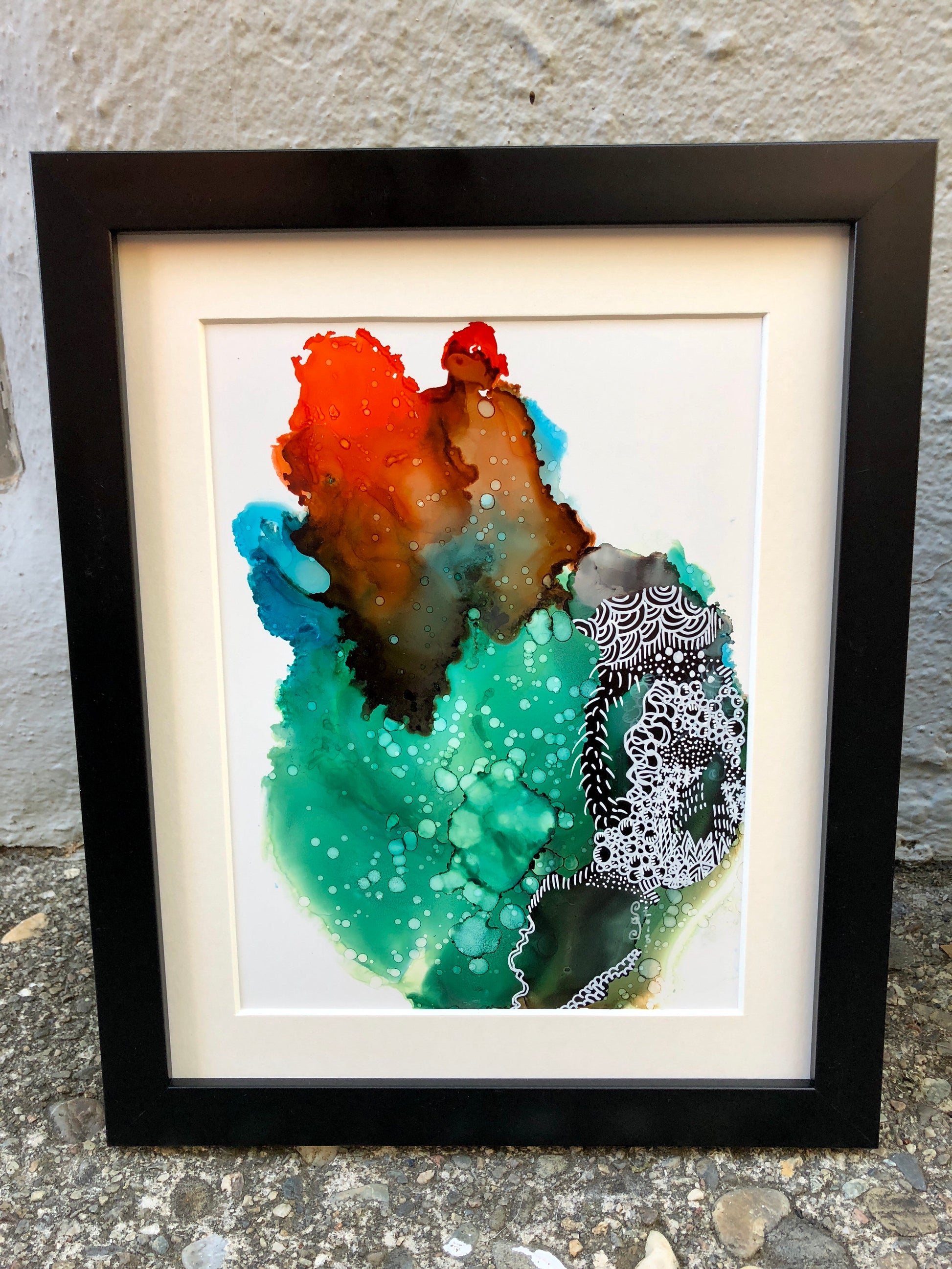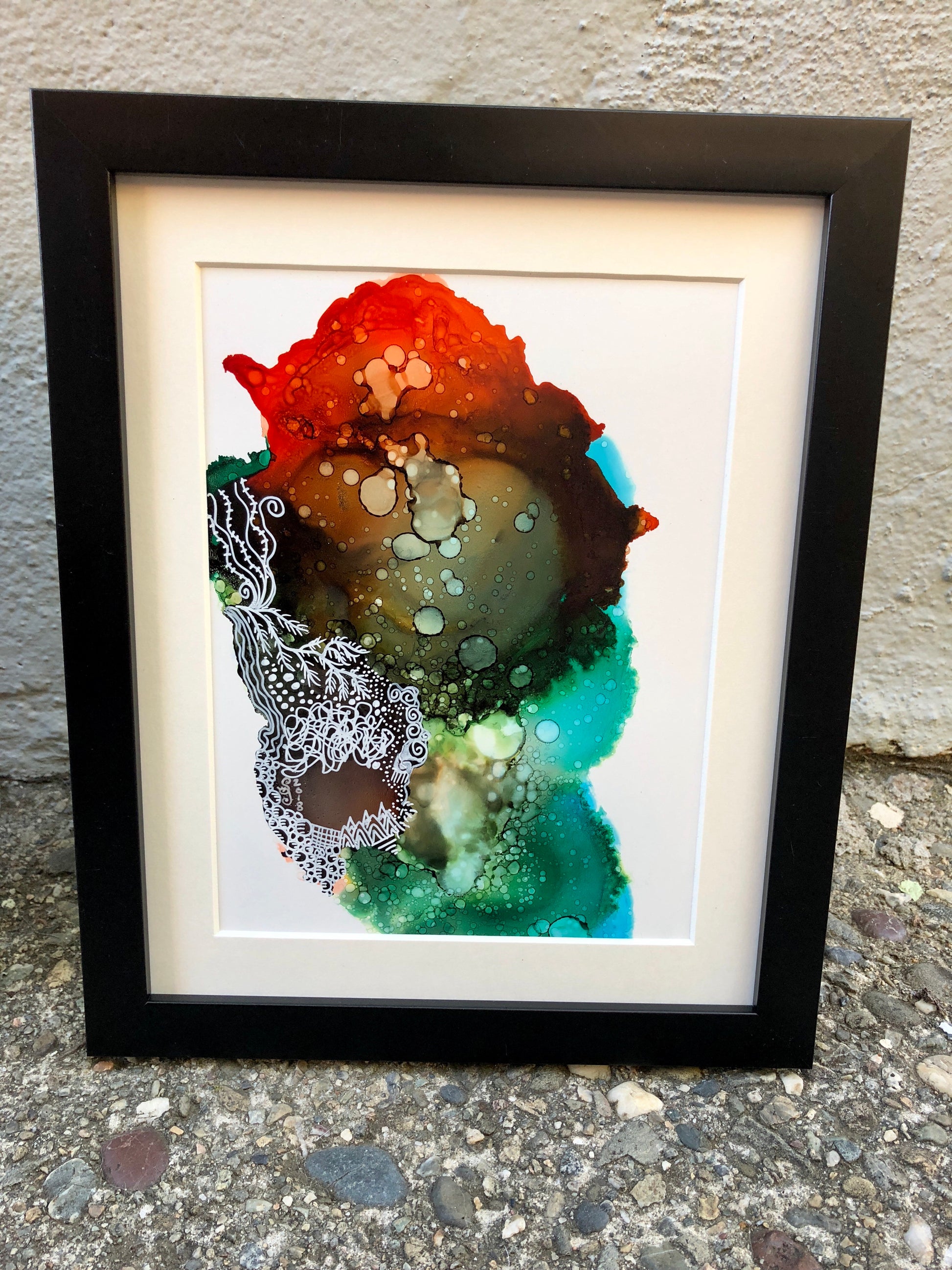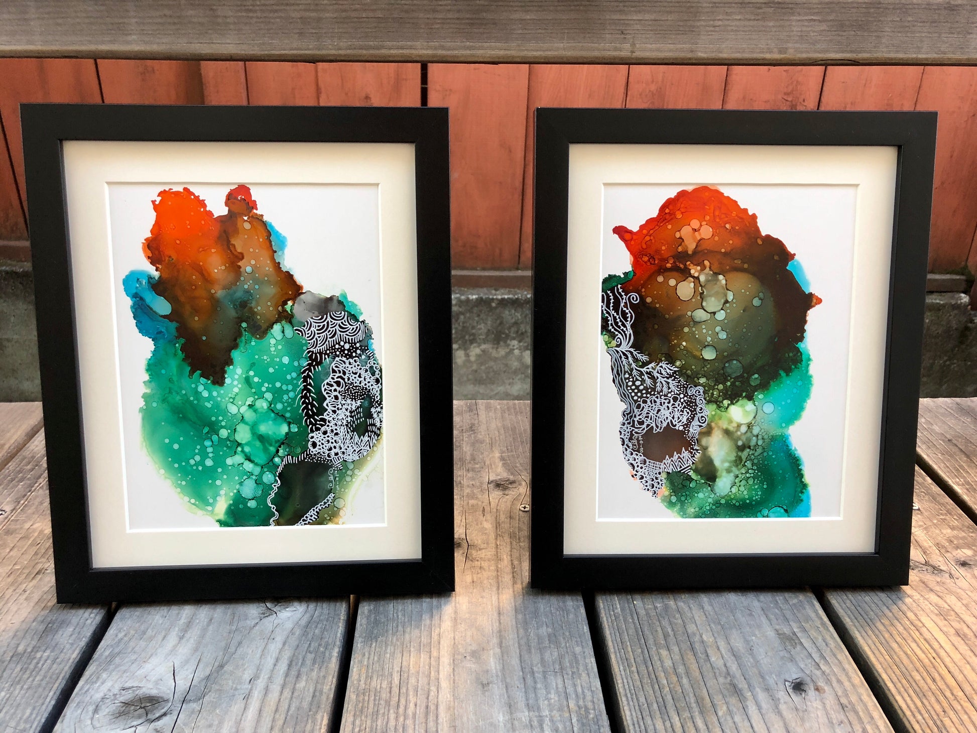 A pair of 8x10 alcohol ink paintings in black frames with white mat.