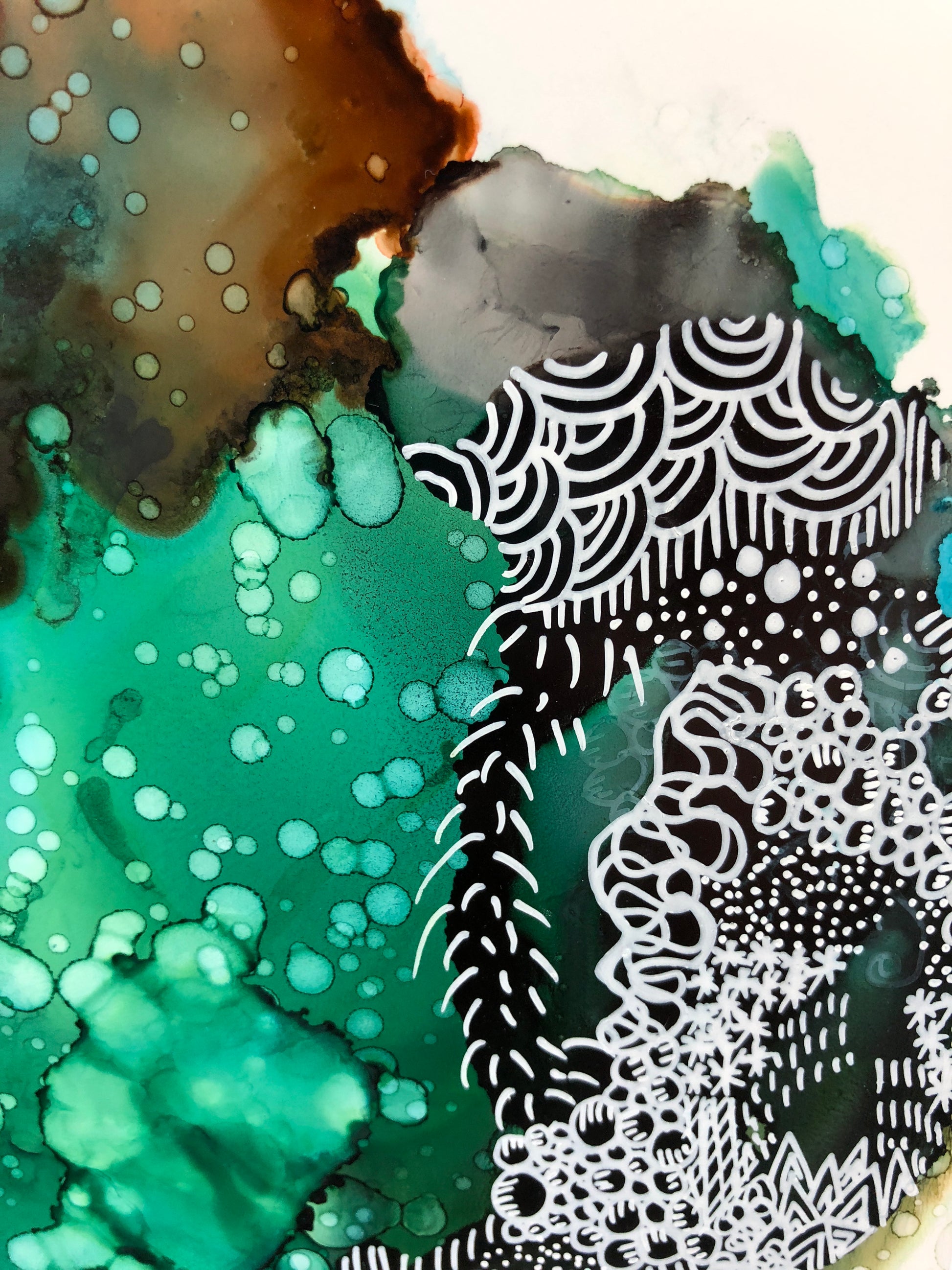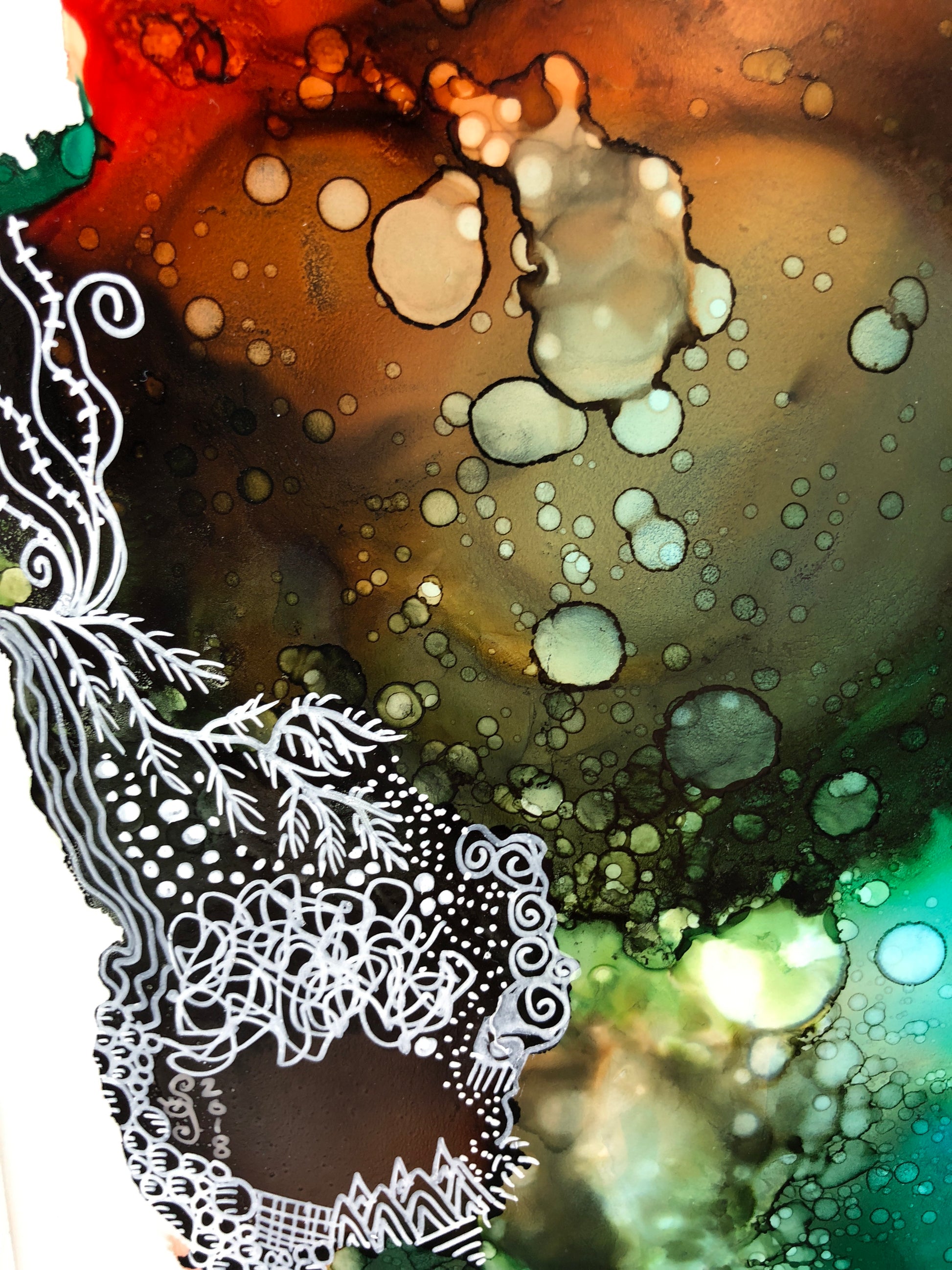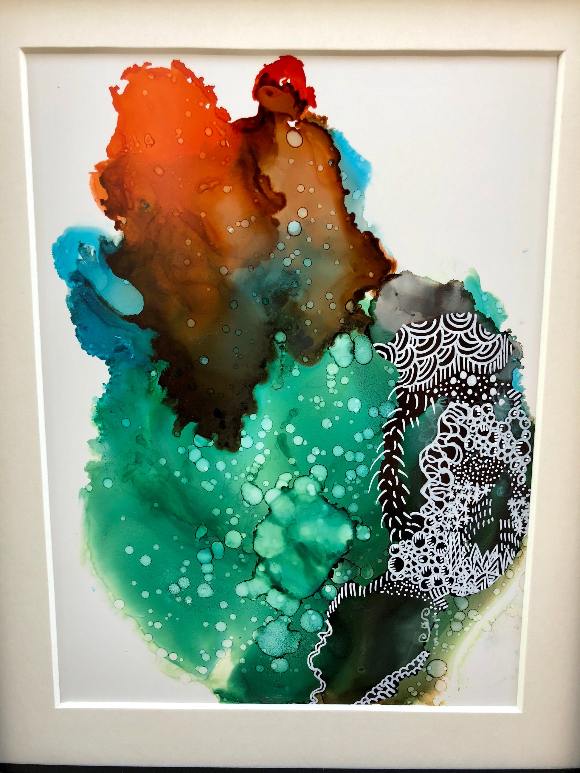 A pair of 8x10 alcohol ink paintings in black frames with white mat.