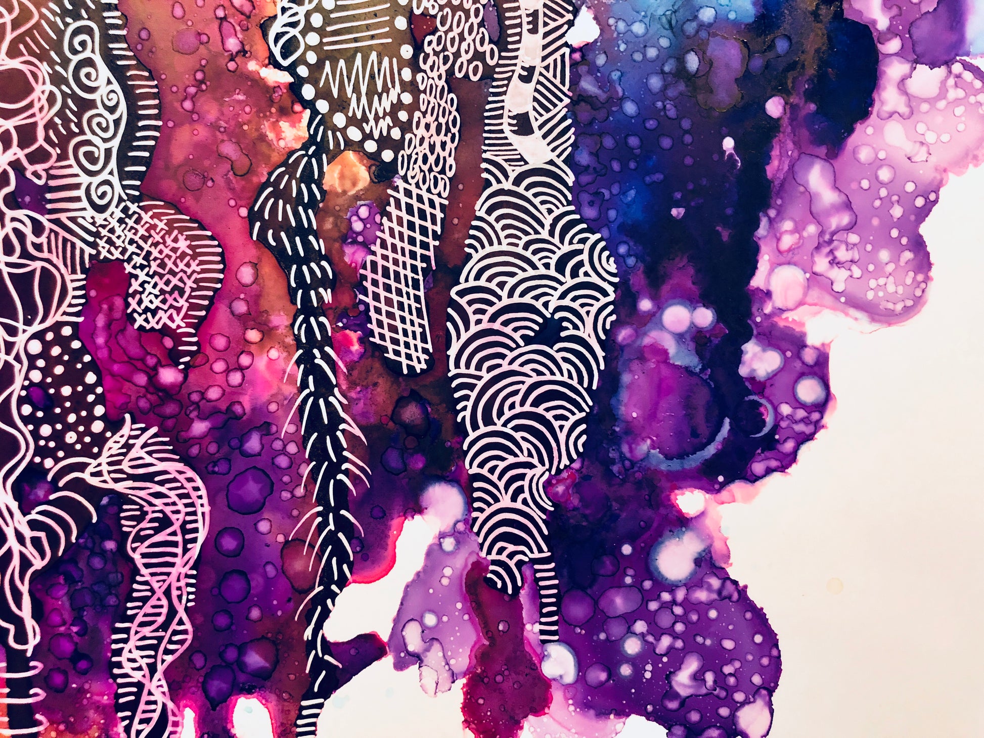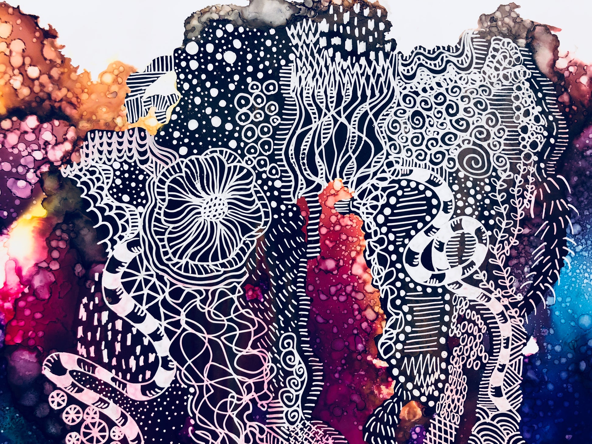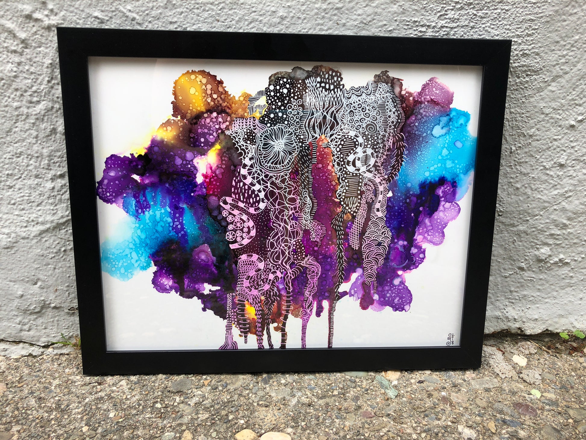 11” x 14” Framed piece of art done with alcohol inks and pen/ink on yupo paper.