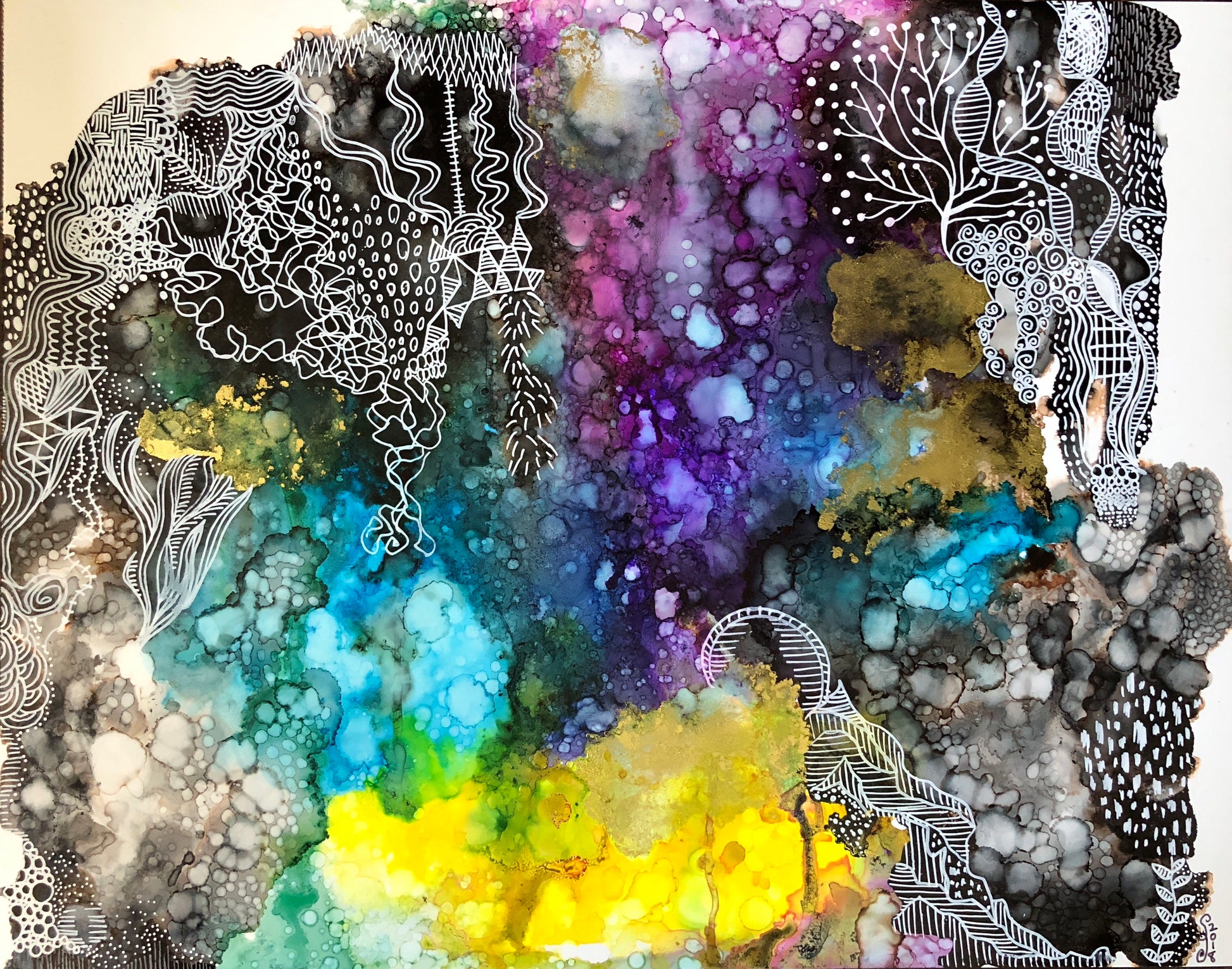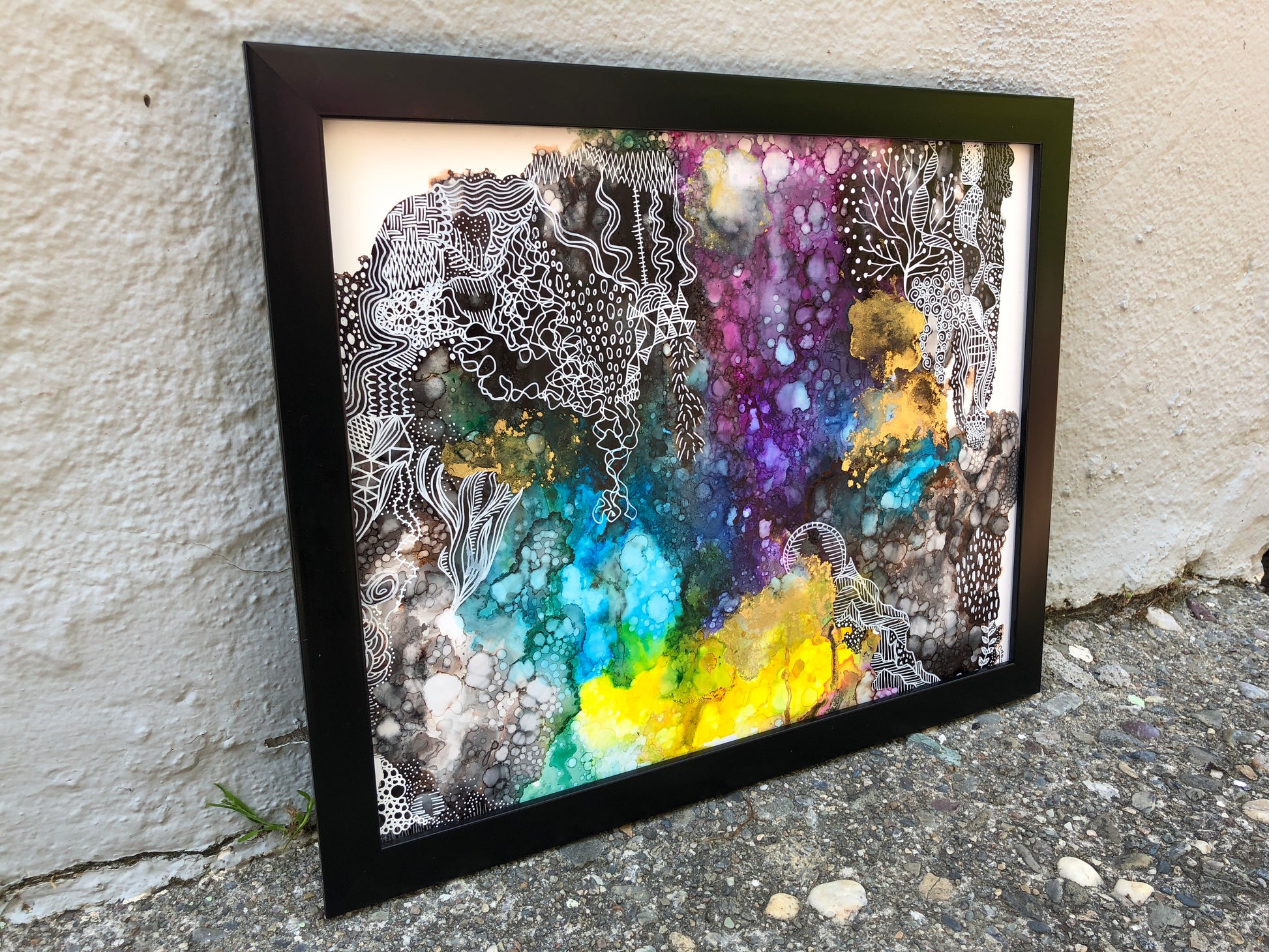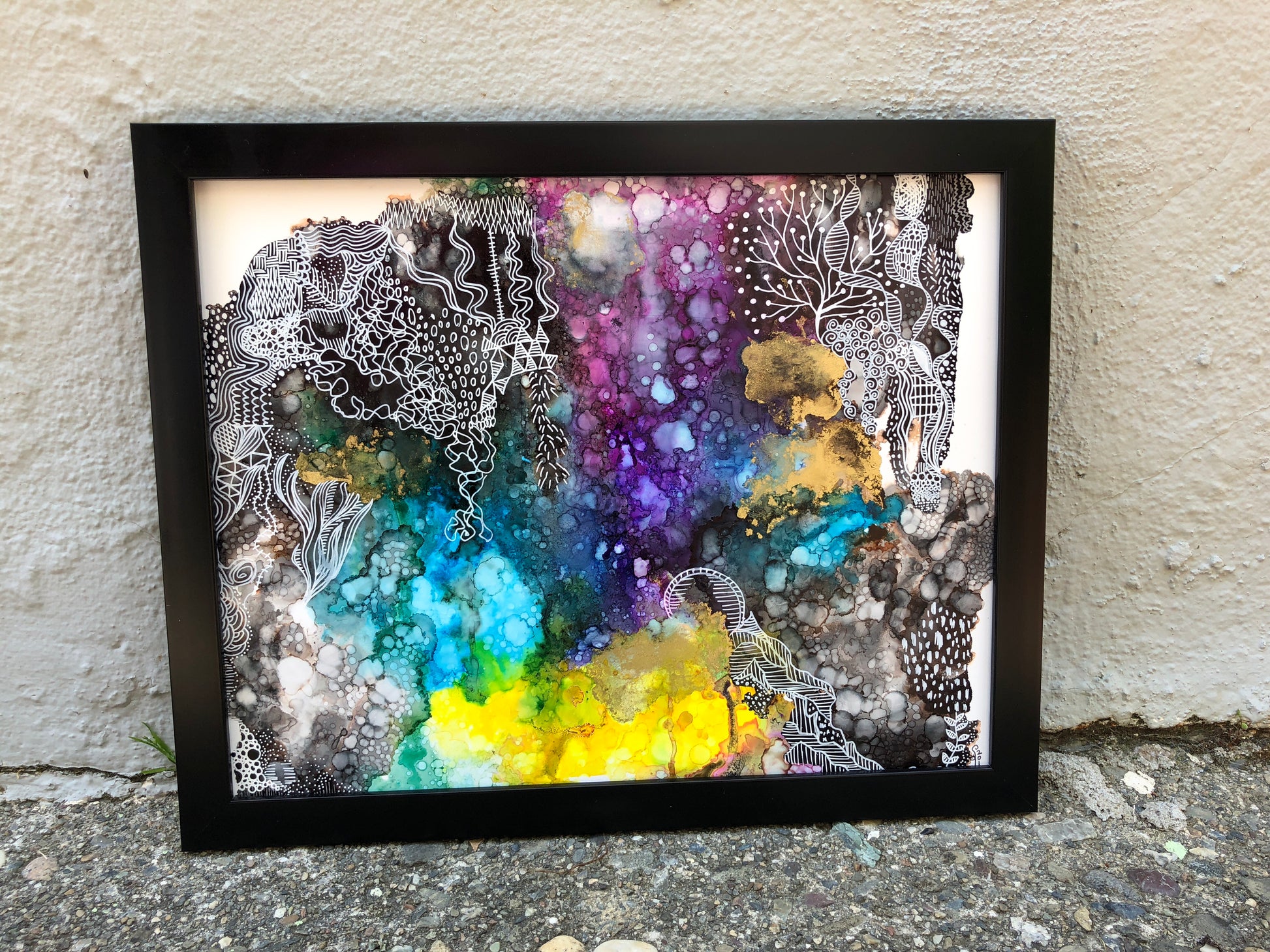 11” x 14” Framed piece of art done with alcohol inks and pen/ink on yupo paper.