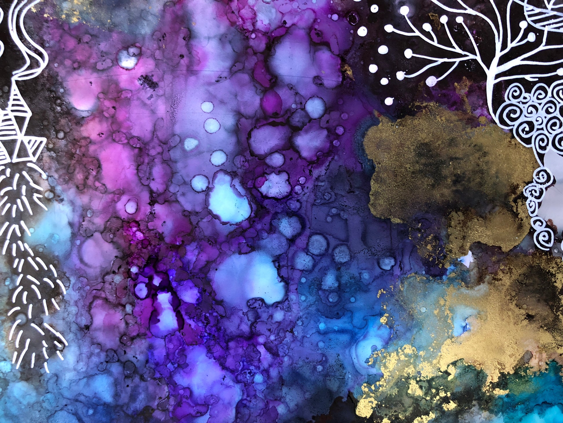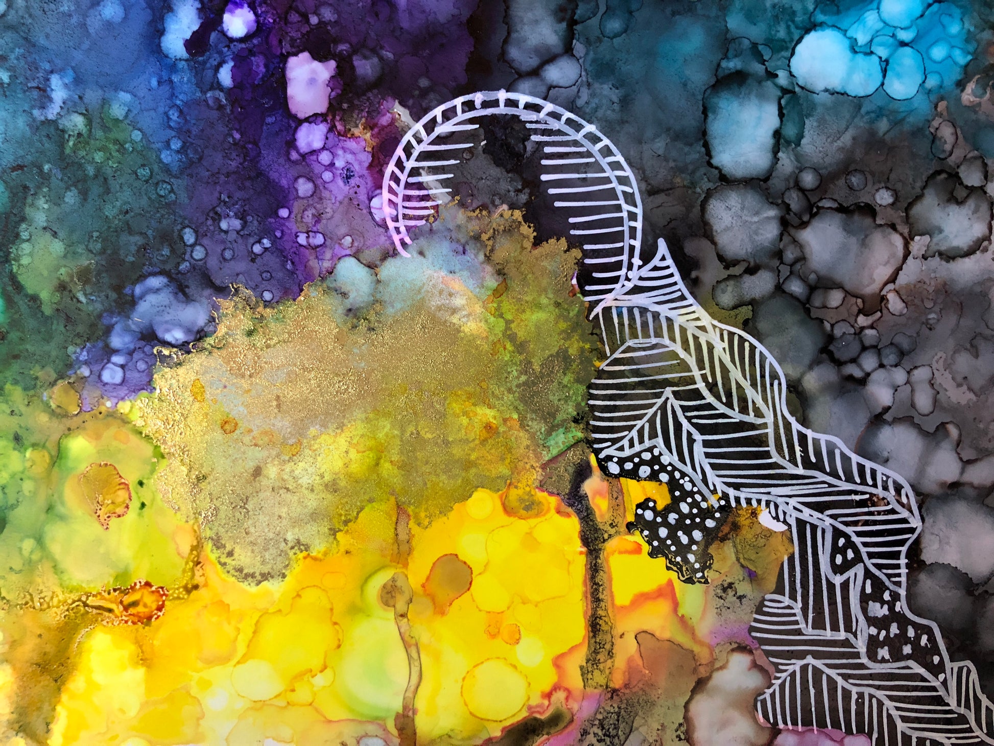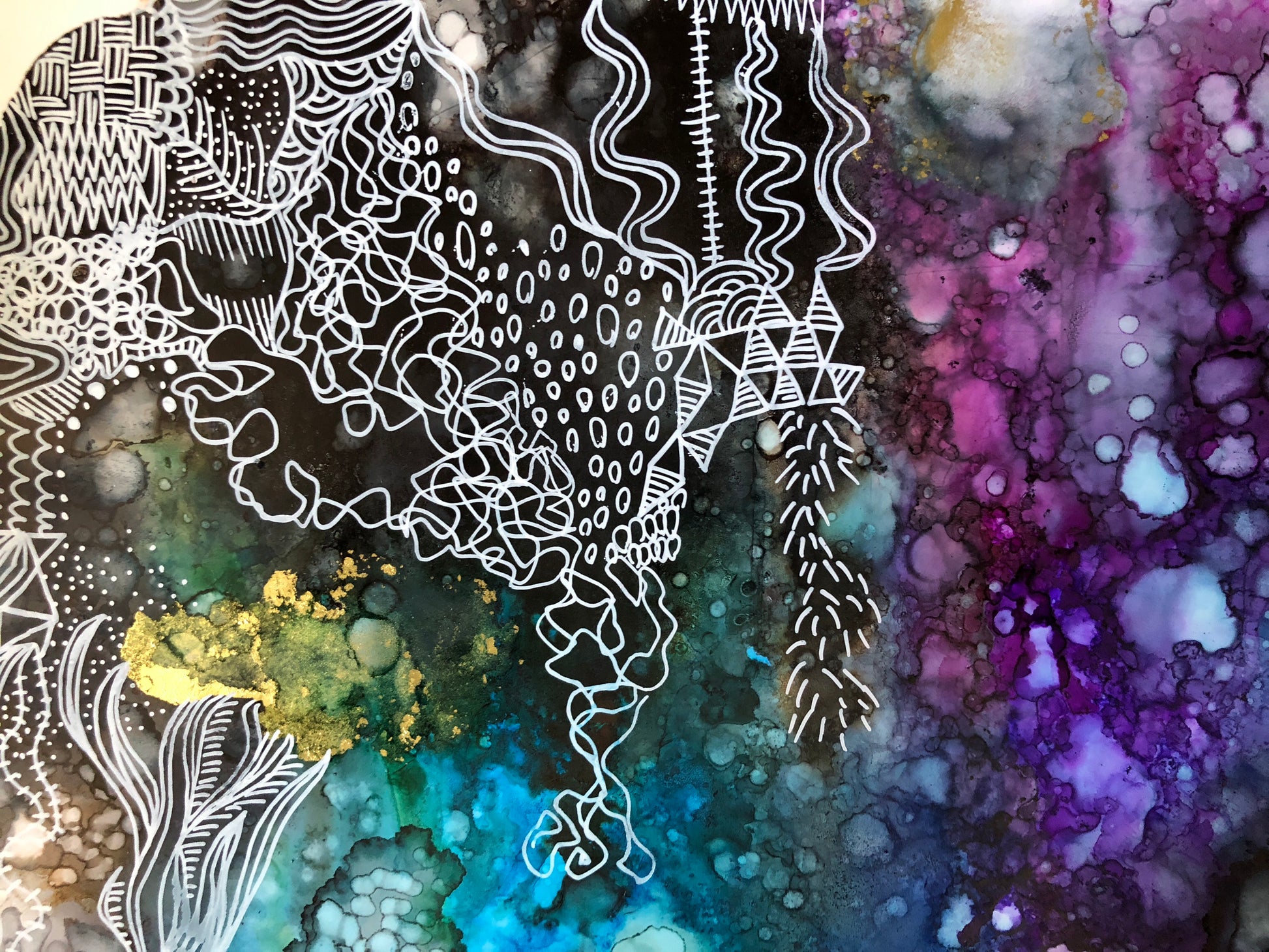 11” x 14” Framed piece of art done with alcohol inks and pen/ink on yupo paper.