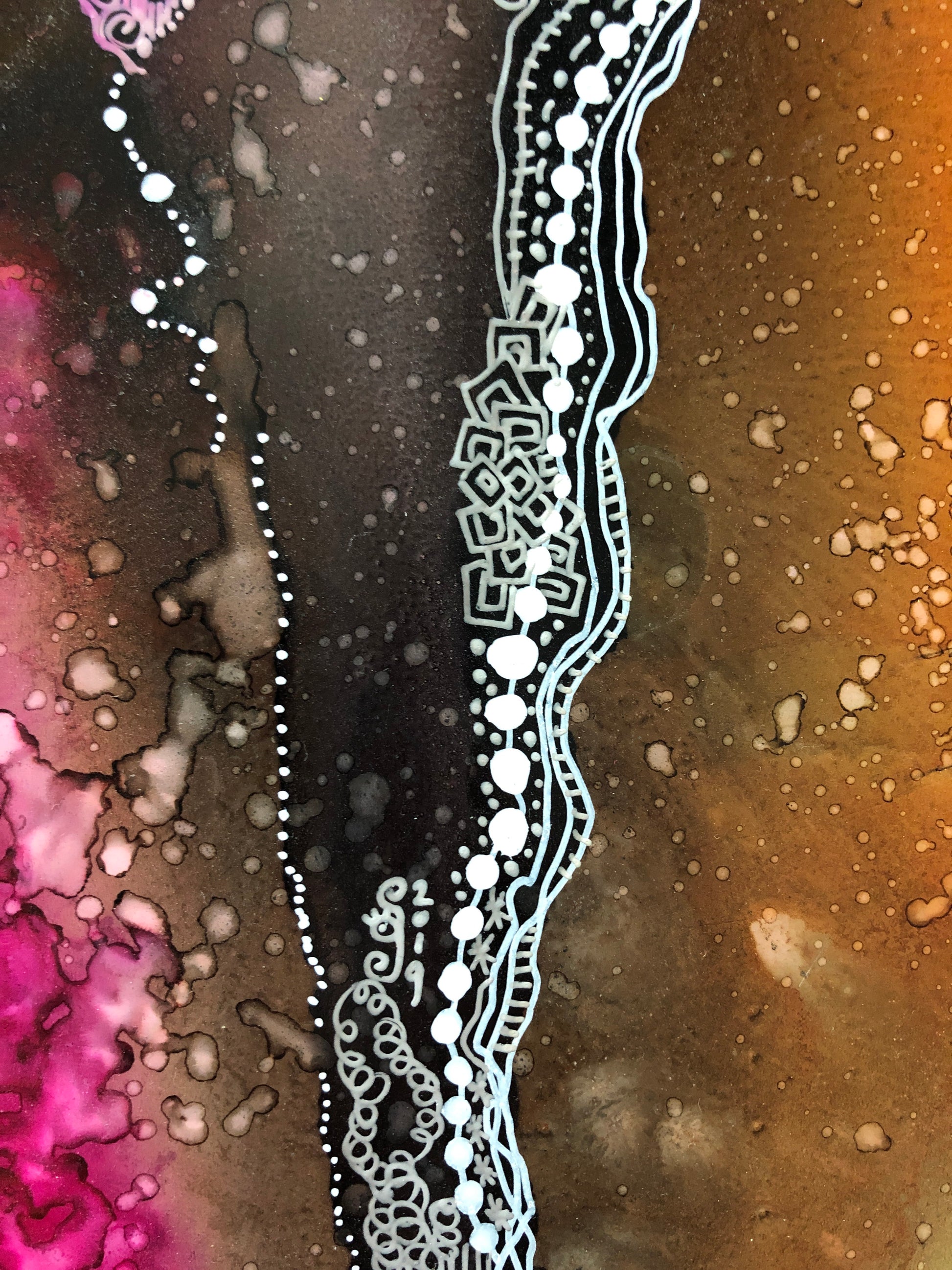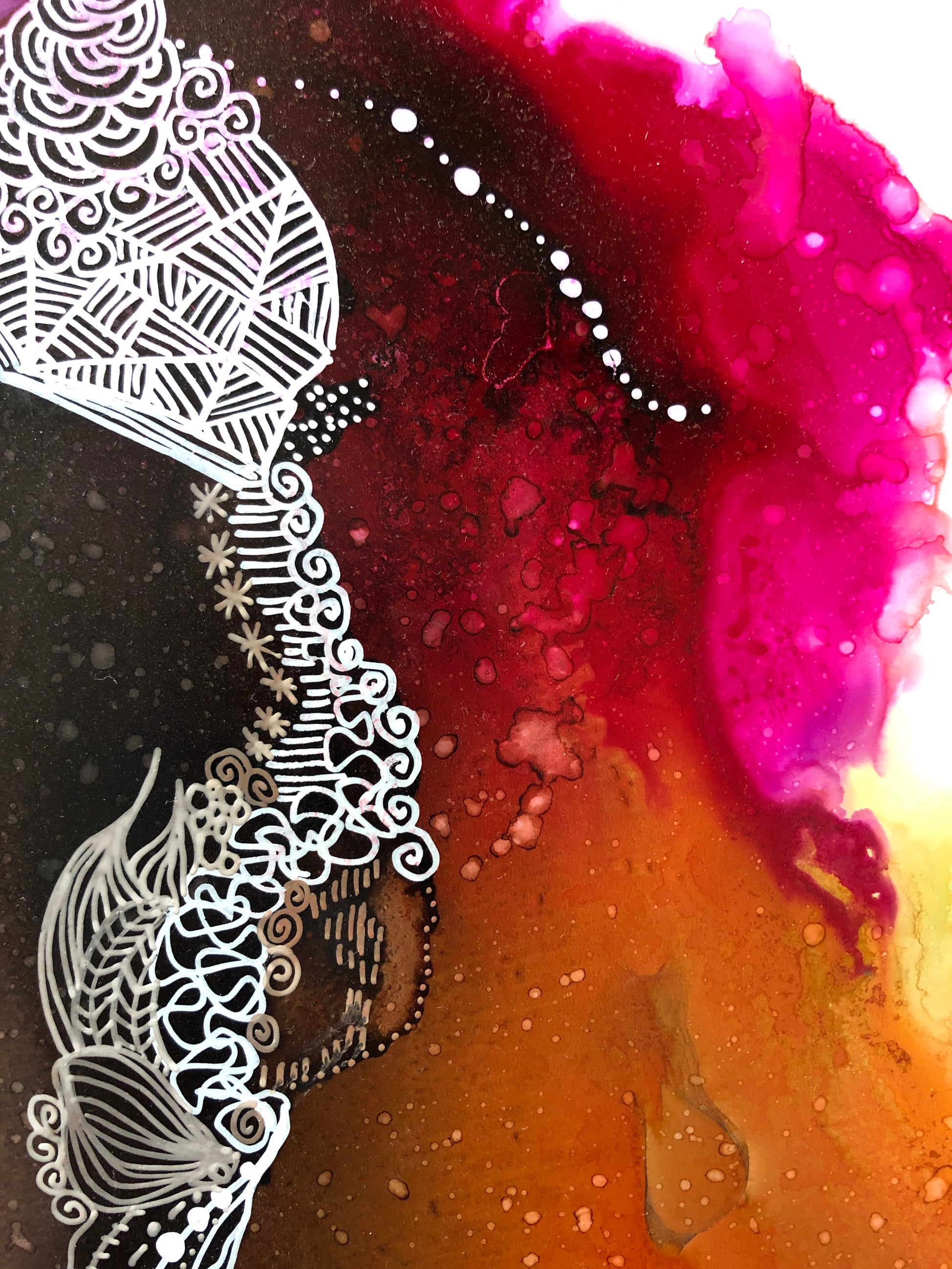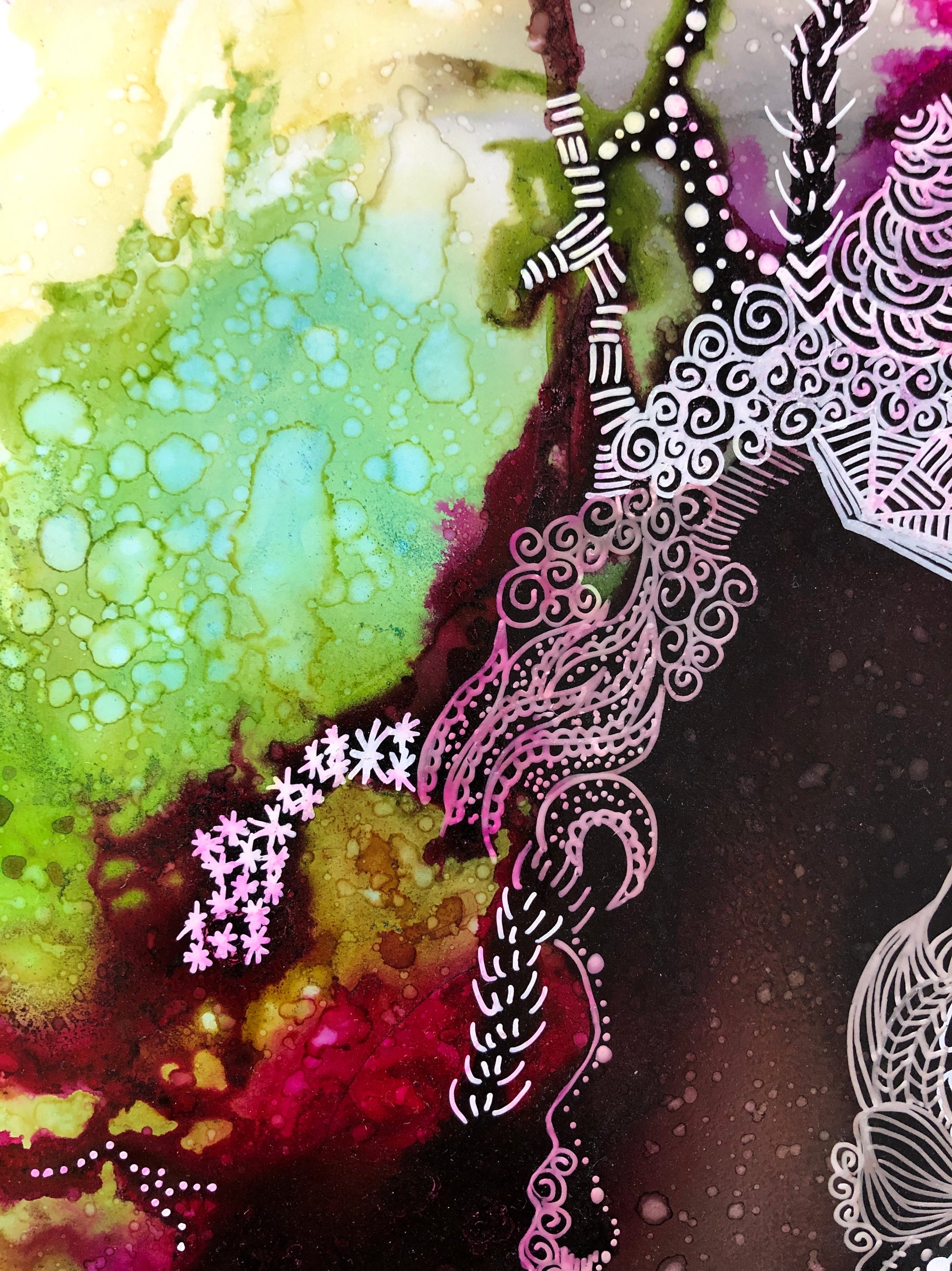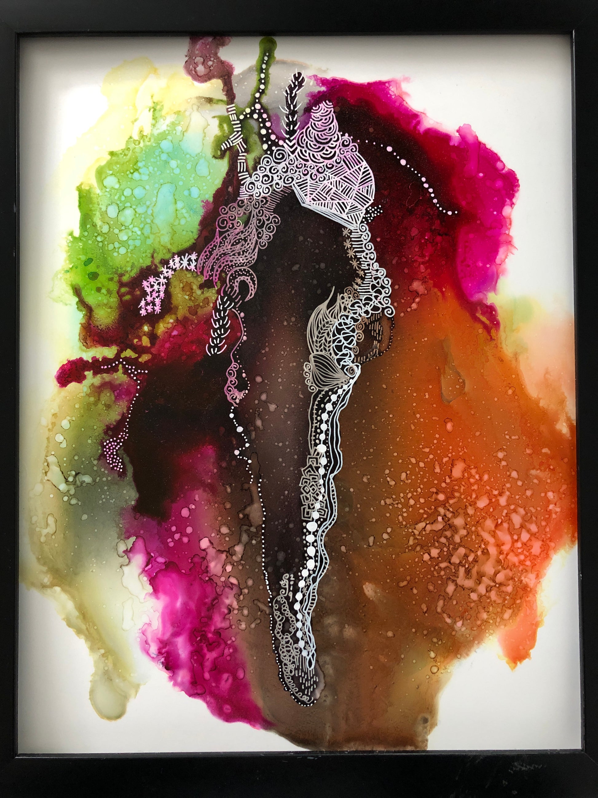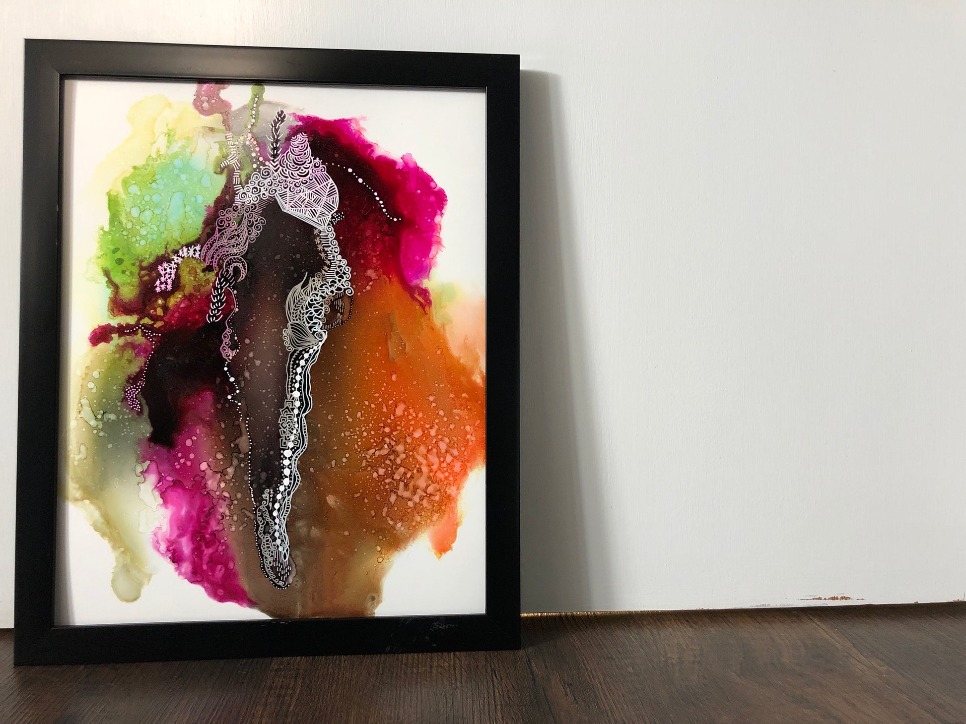 11” x 14” framed piece of art done with alcohol inks and pen/ink on yupo paper.