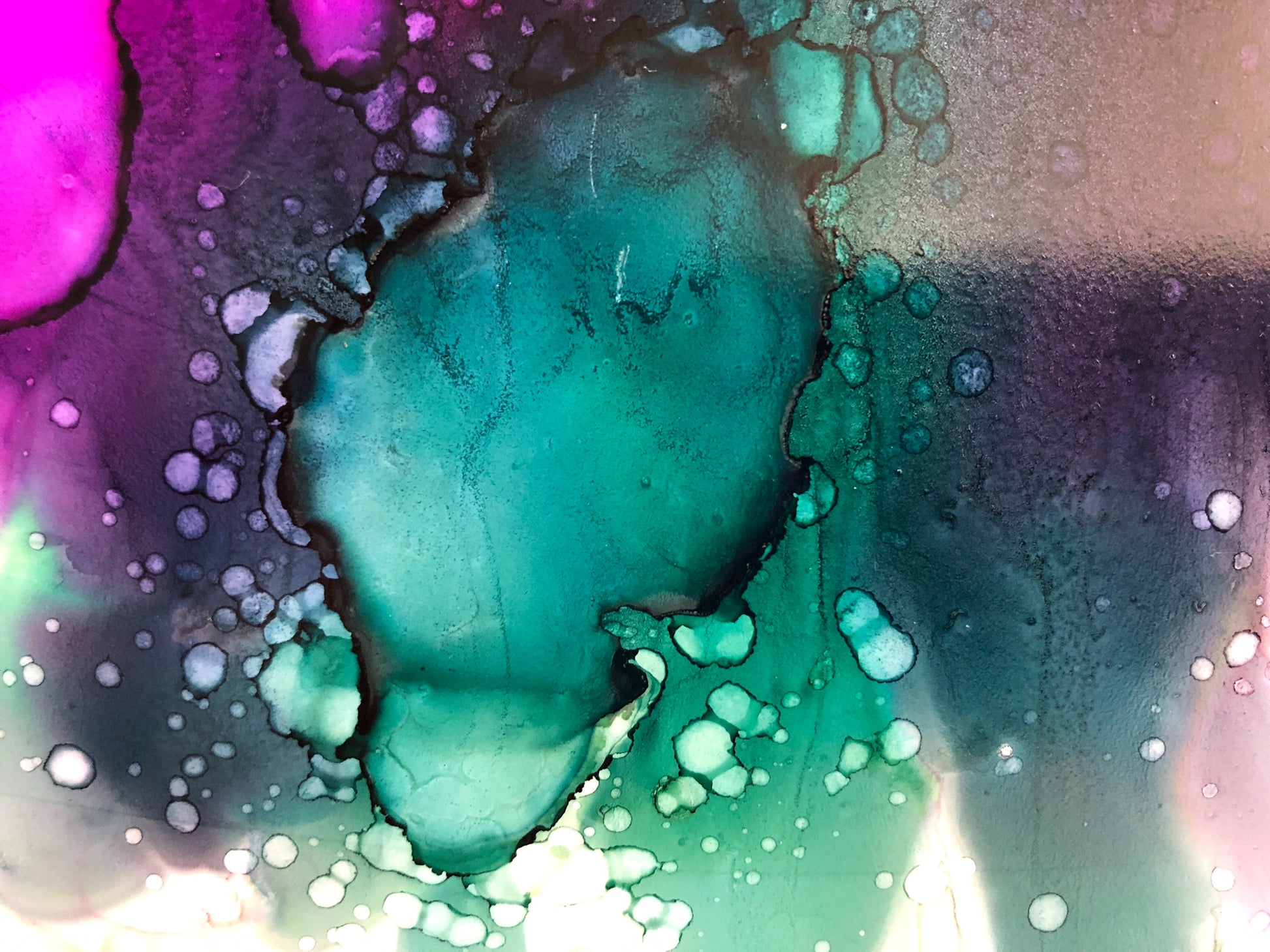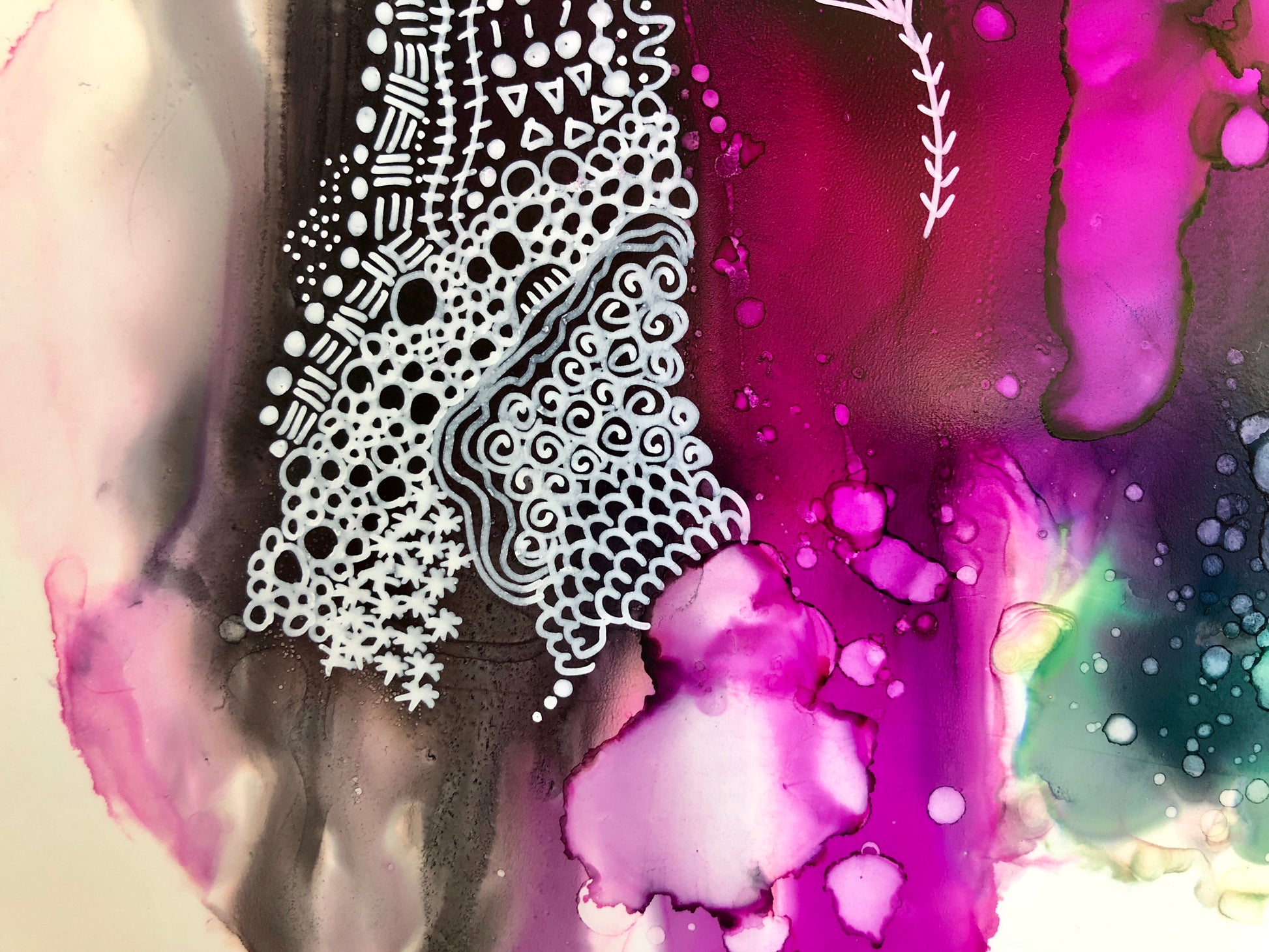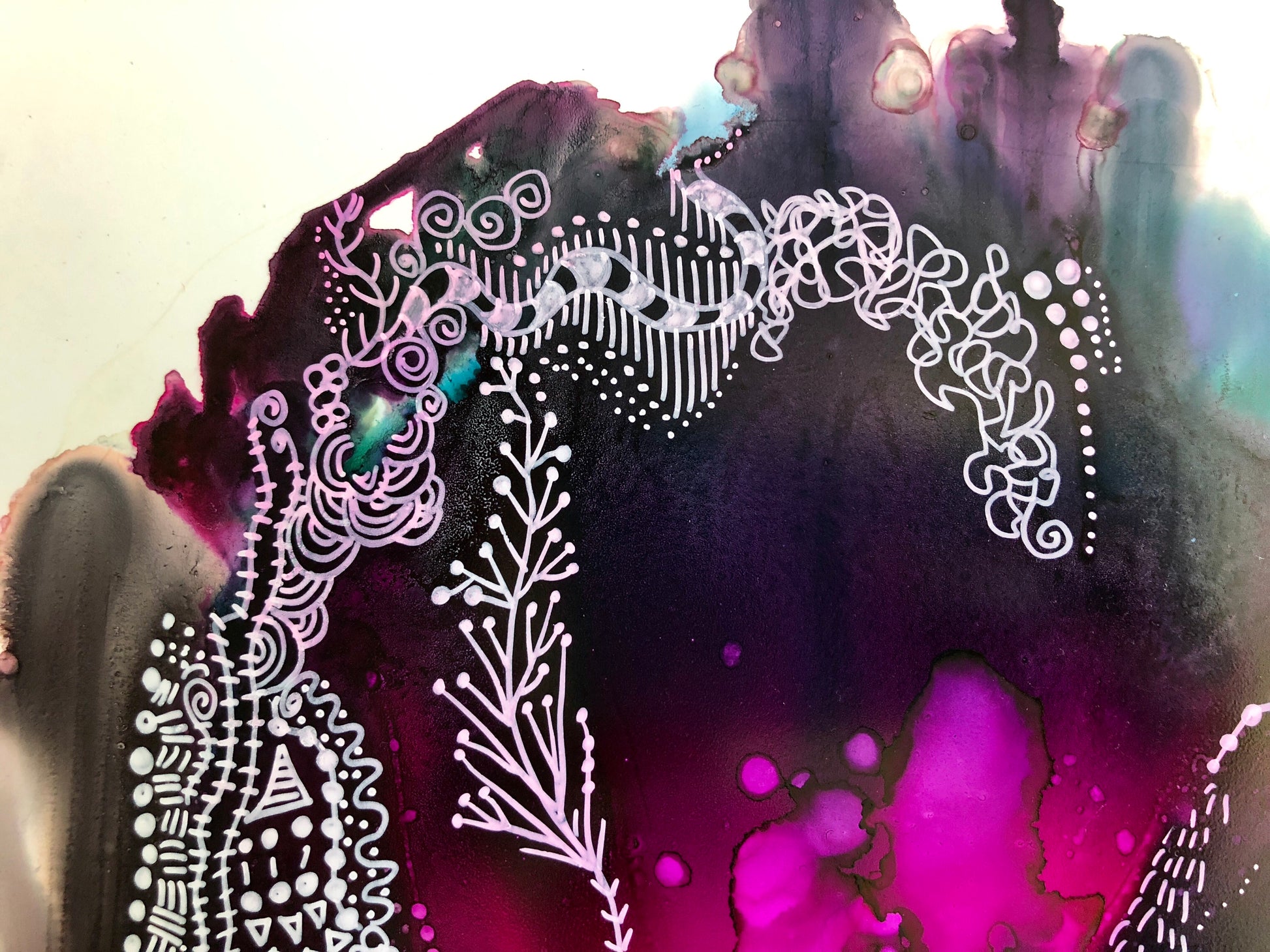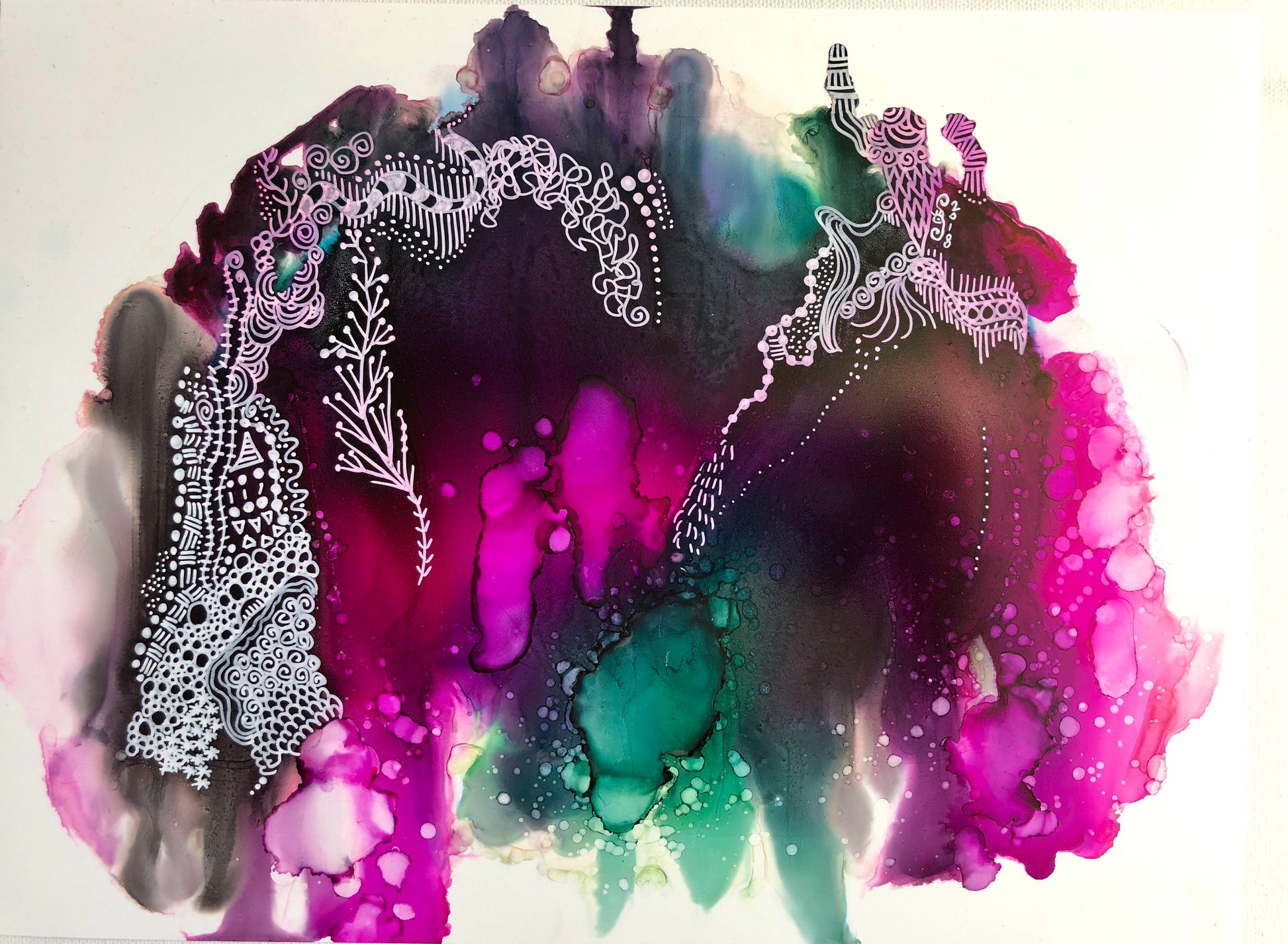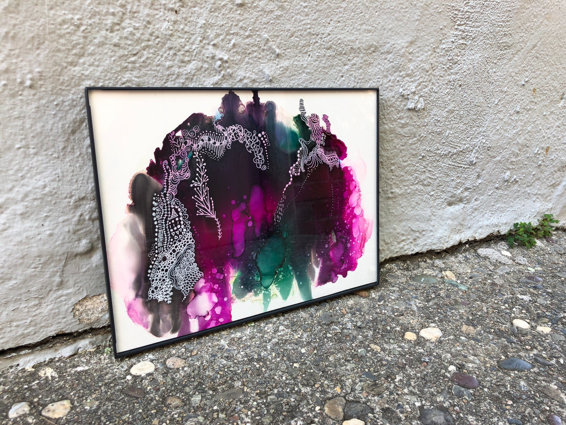 9” x 12” Framed piece of art created with alcohol inks and pen/ink on yupo paper.