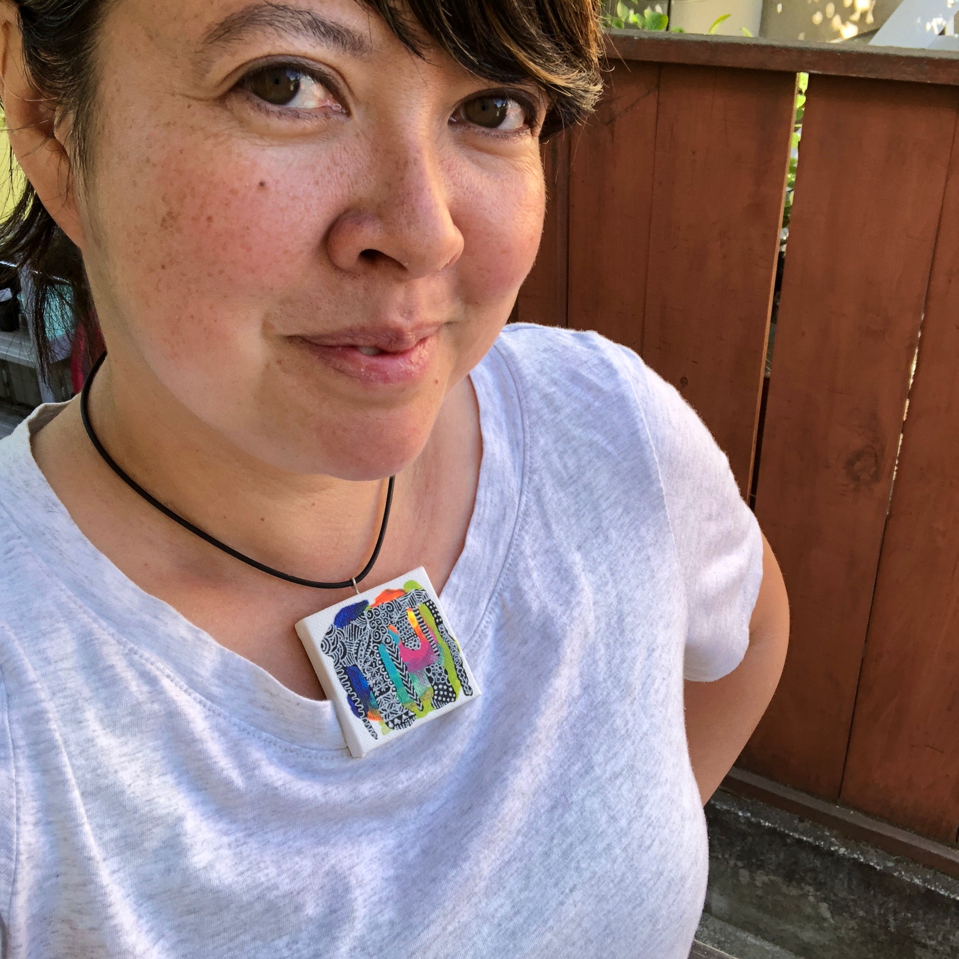 Mini canvas necklace paintings. 2”x 2” on rubber silkie necklace 16” cord.