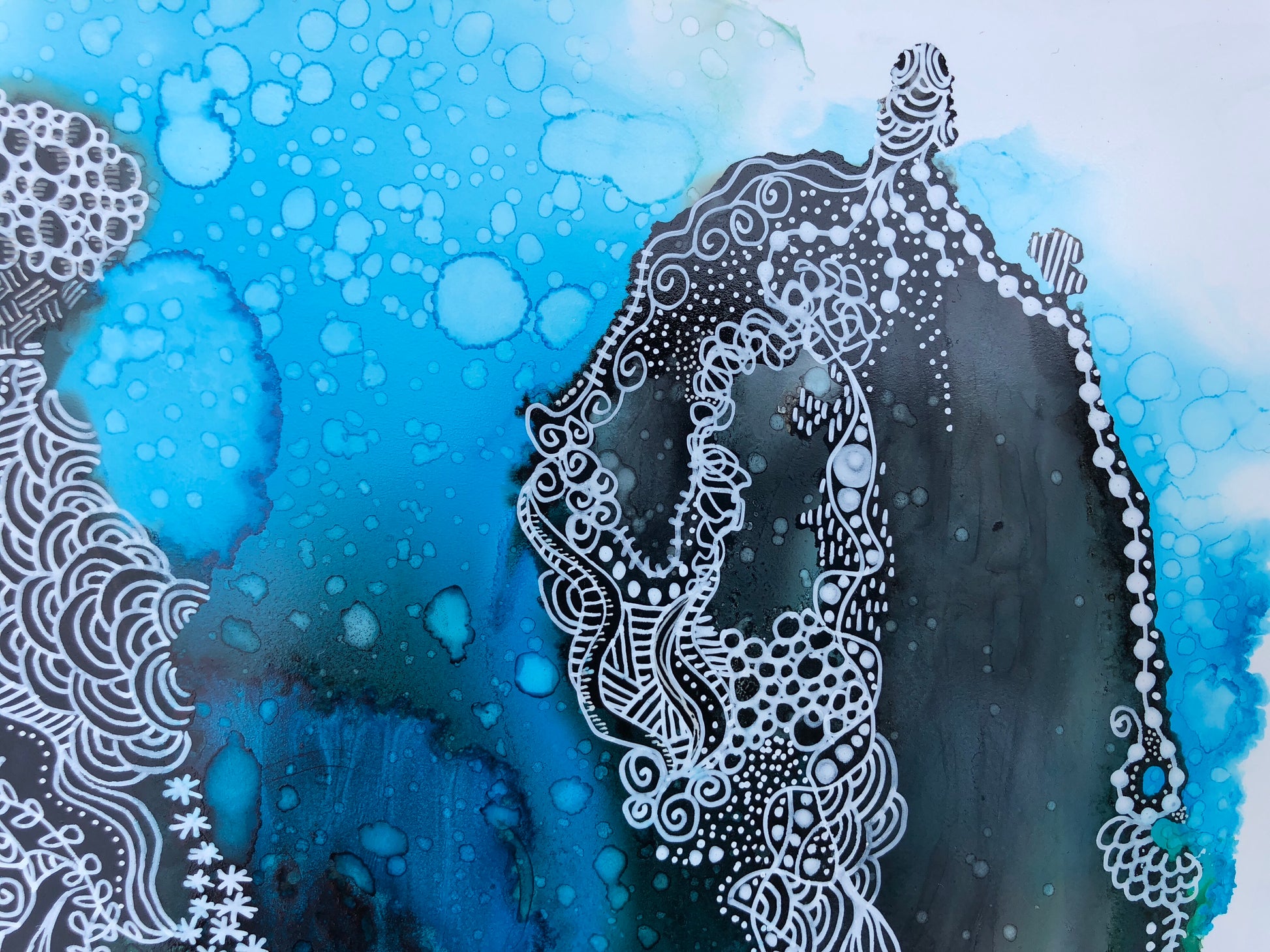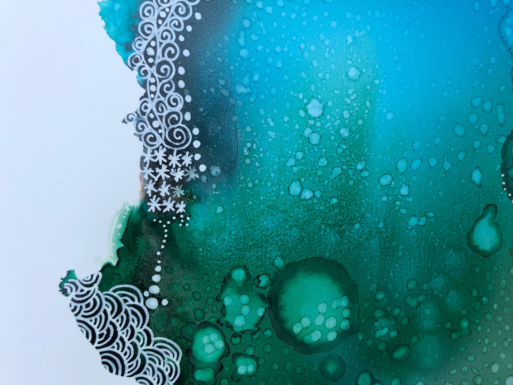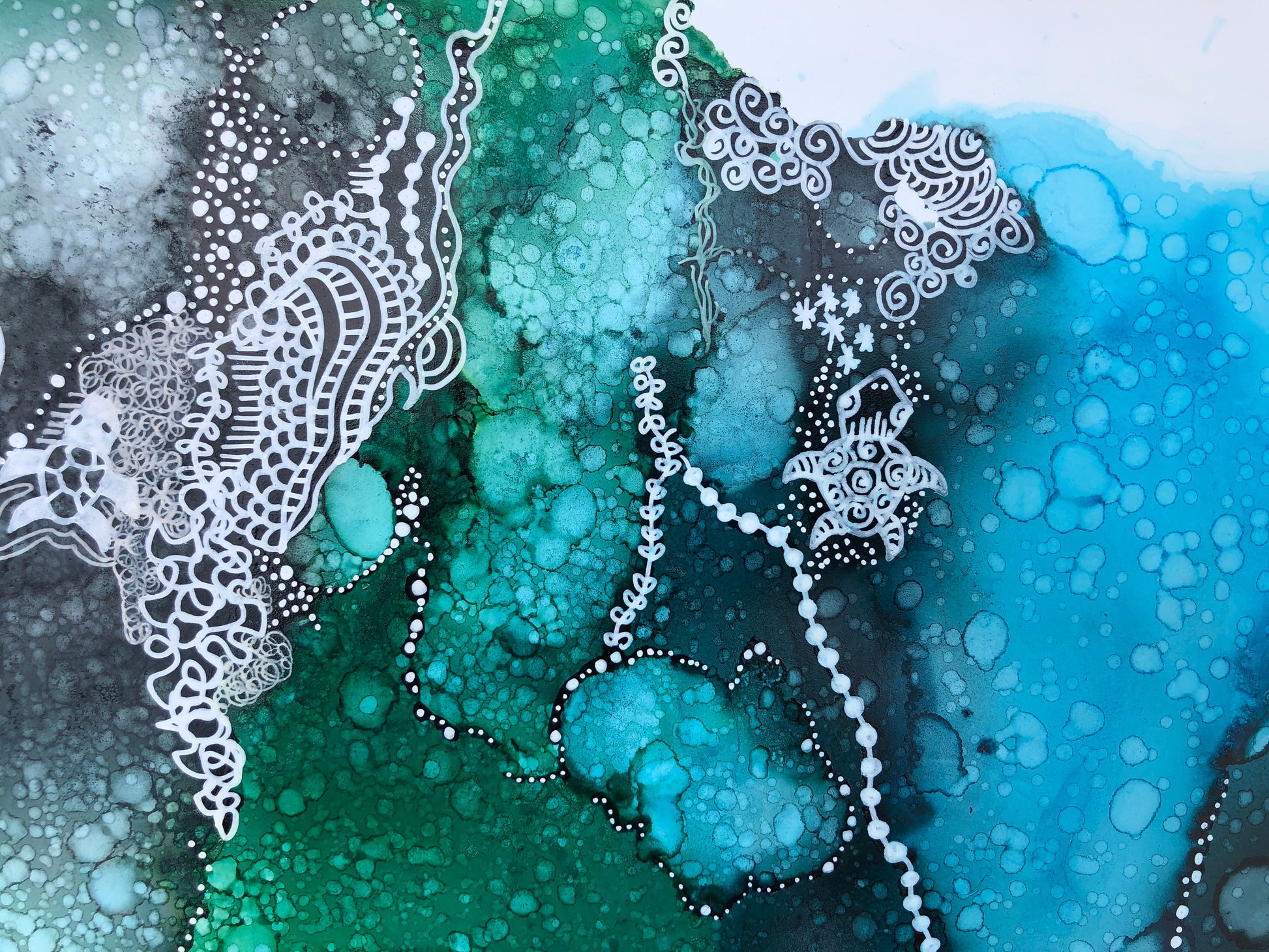 Three 11”x14” ocean themed alcohol ink pieces with white paint pen detail. No frames included by request. Special commission series.