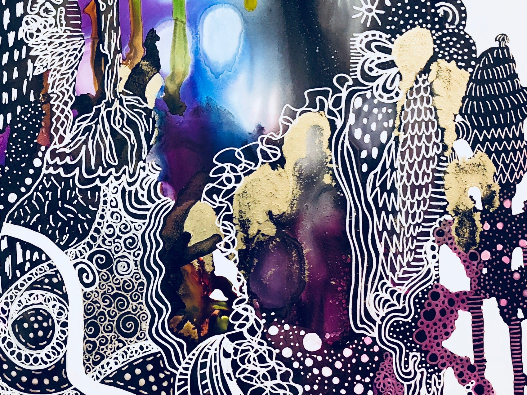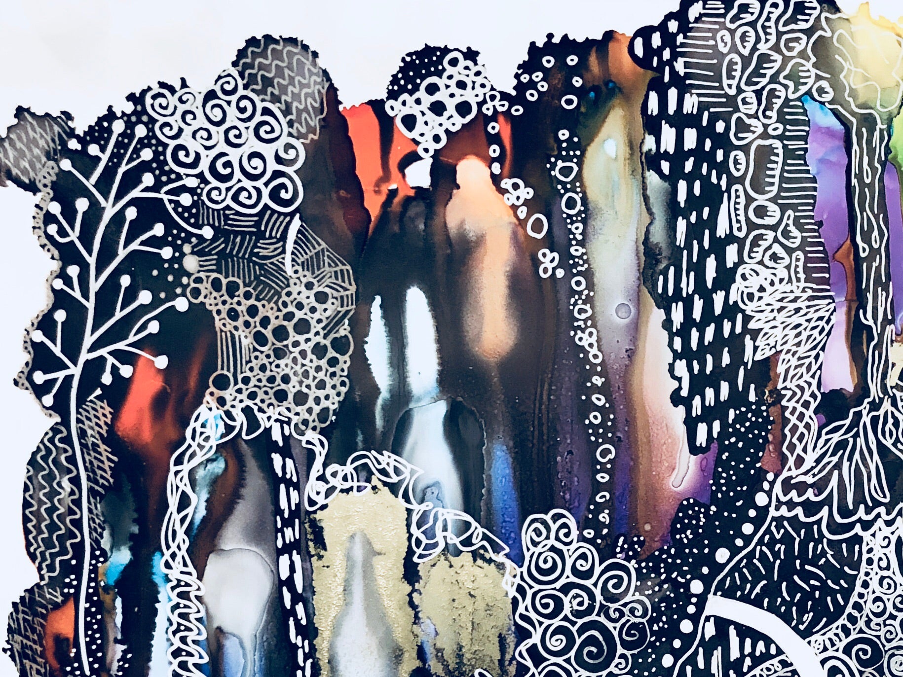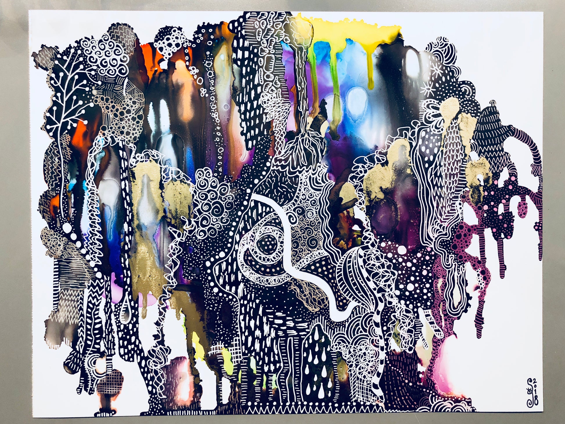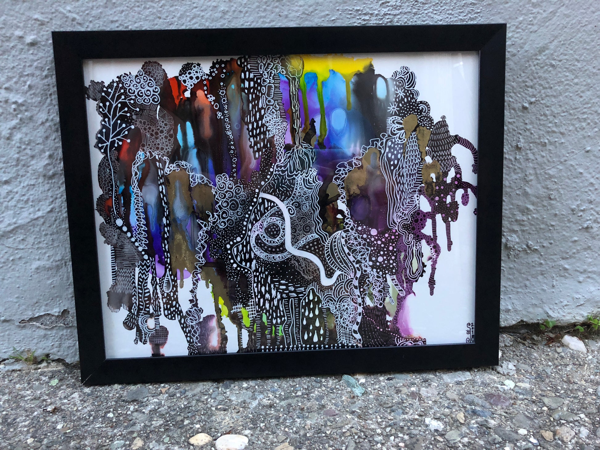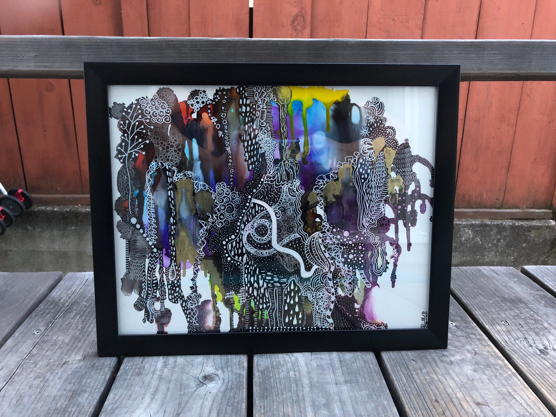 11” x 14” Framed piece of art done with alcohol inks and pen/ink on yupo paper.