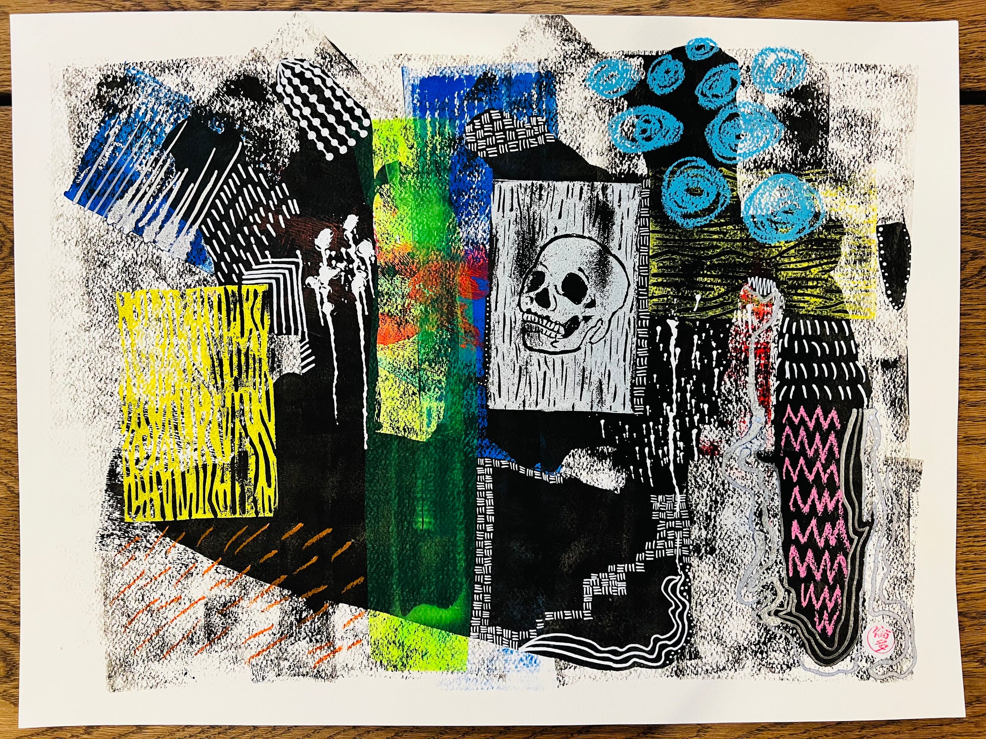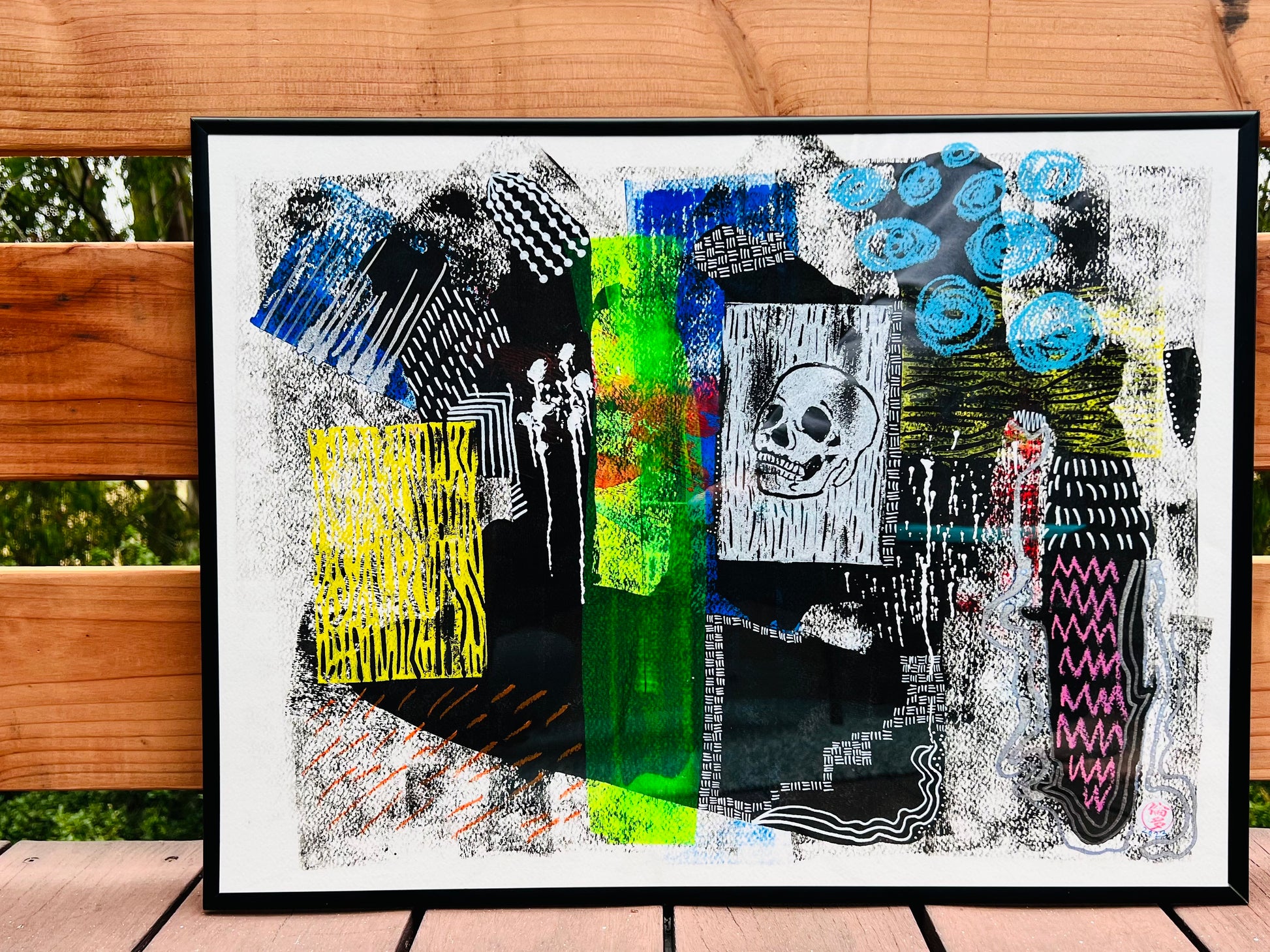 18"x24" Framed Skull Block Print Mixed media piece on thick watercolor paper