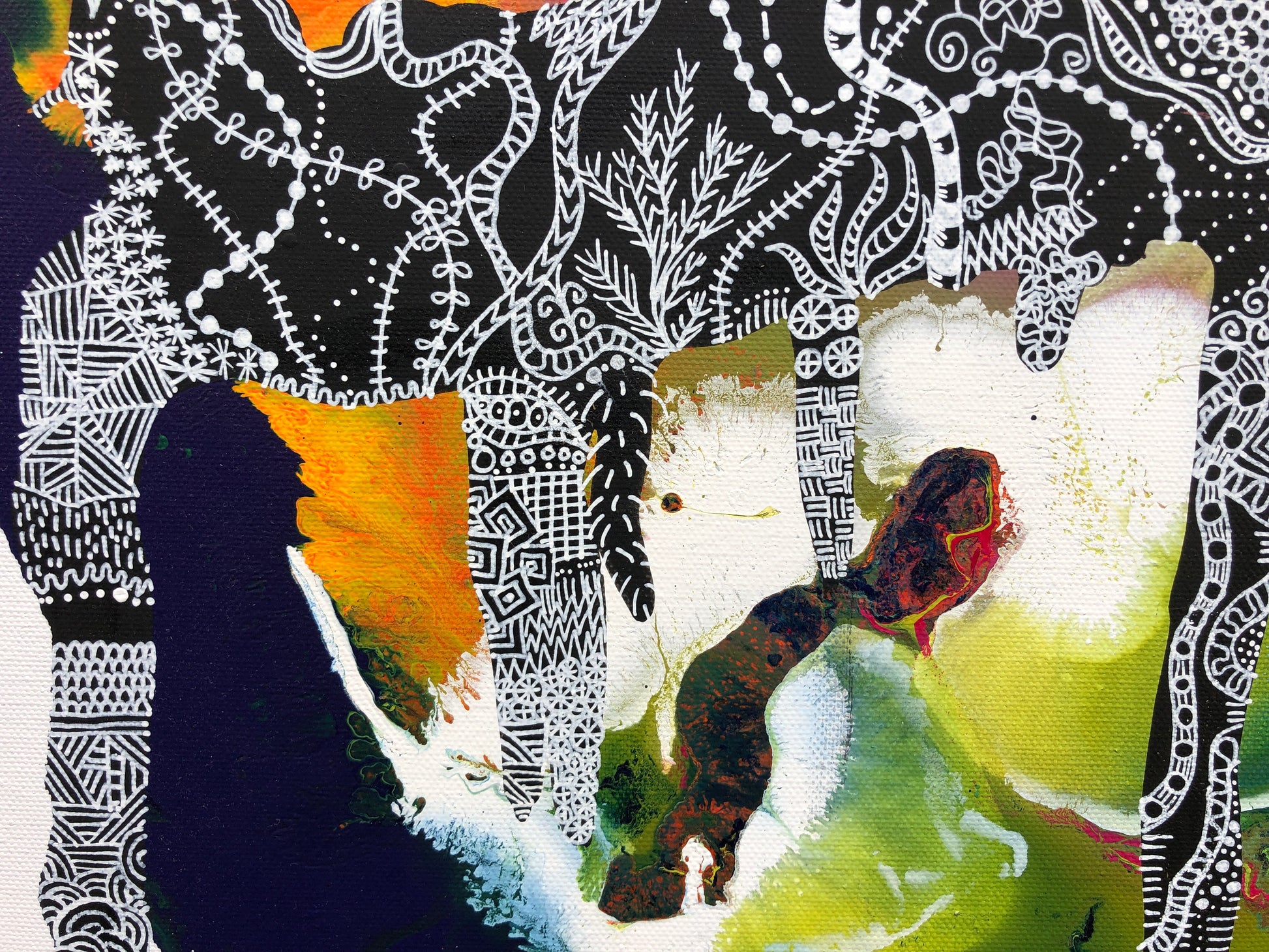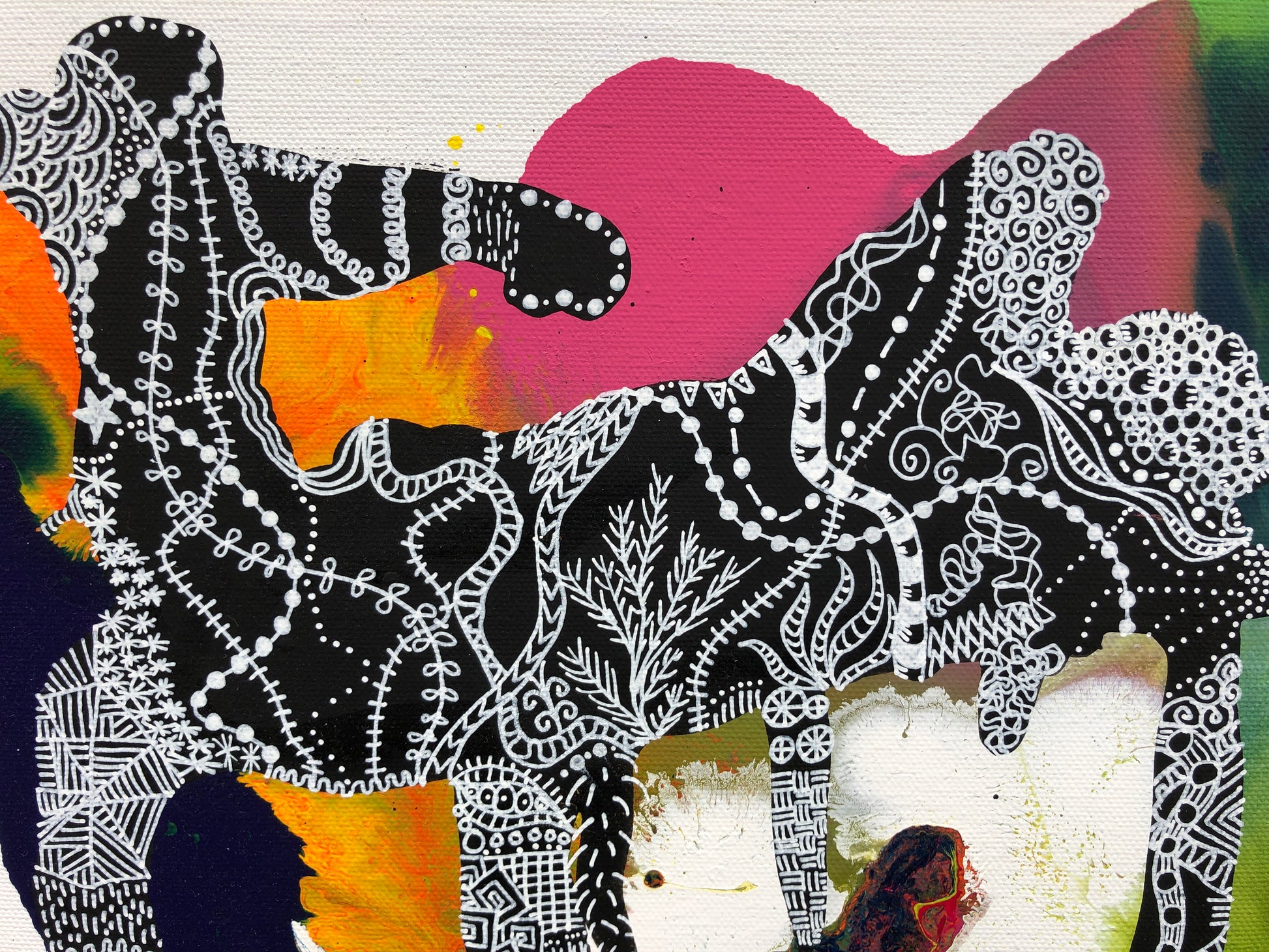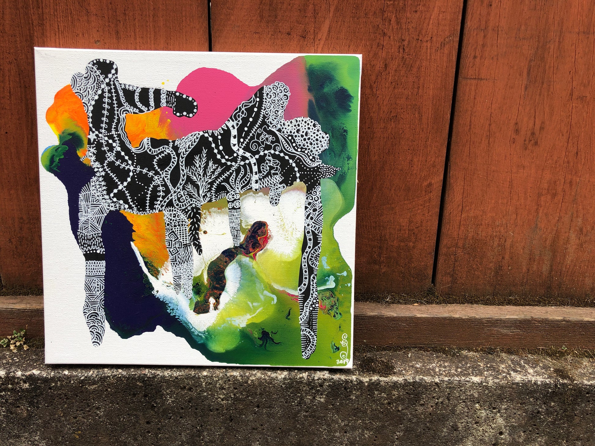 Acrylic painting with white pen detail on 12” x 12” canvas. Rough edges. Please put in the notes if you would like black finished edges.