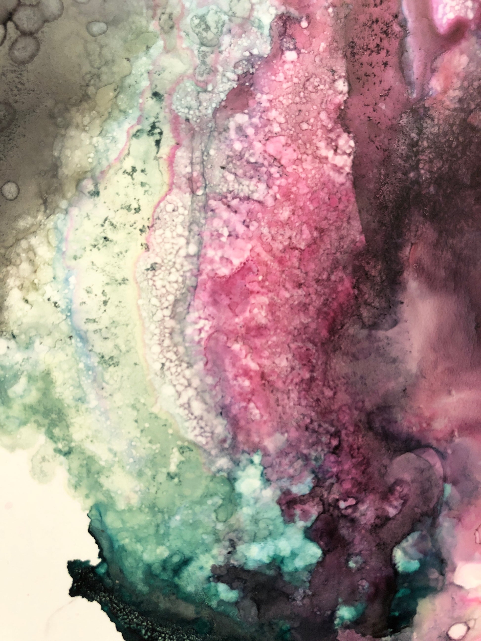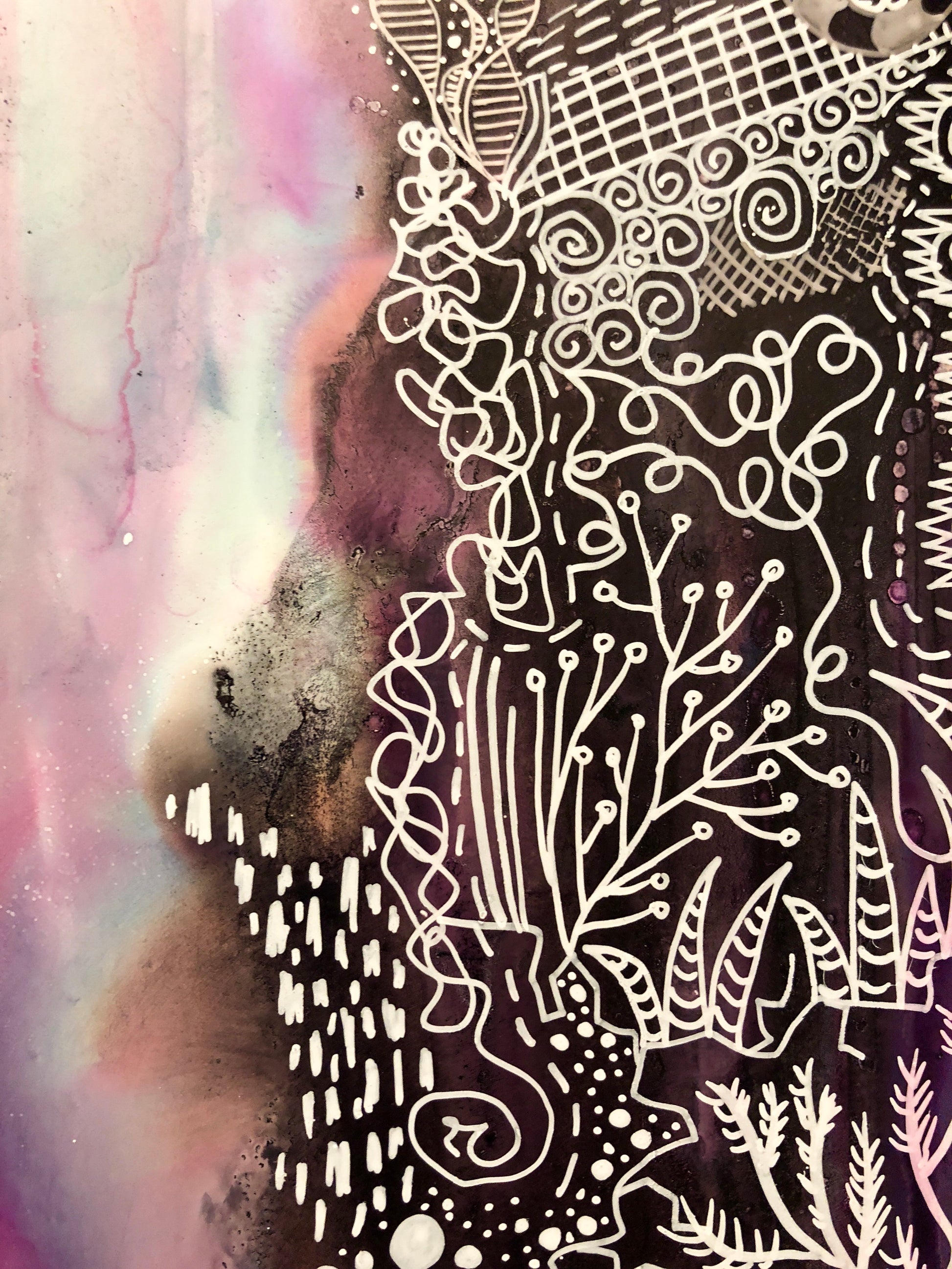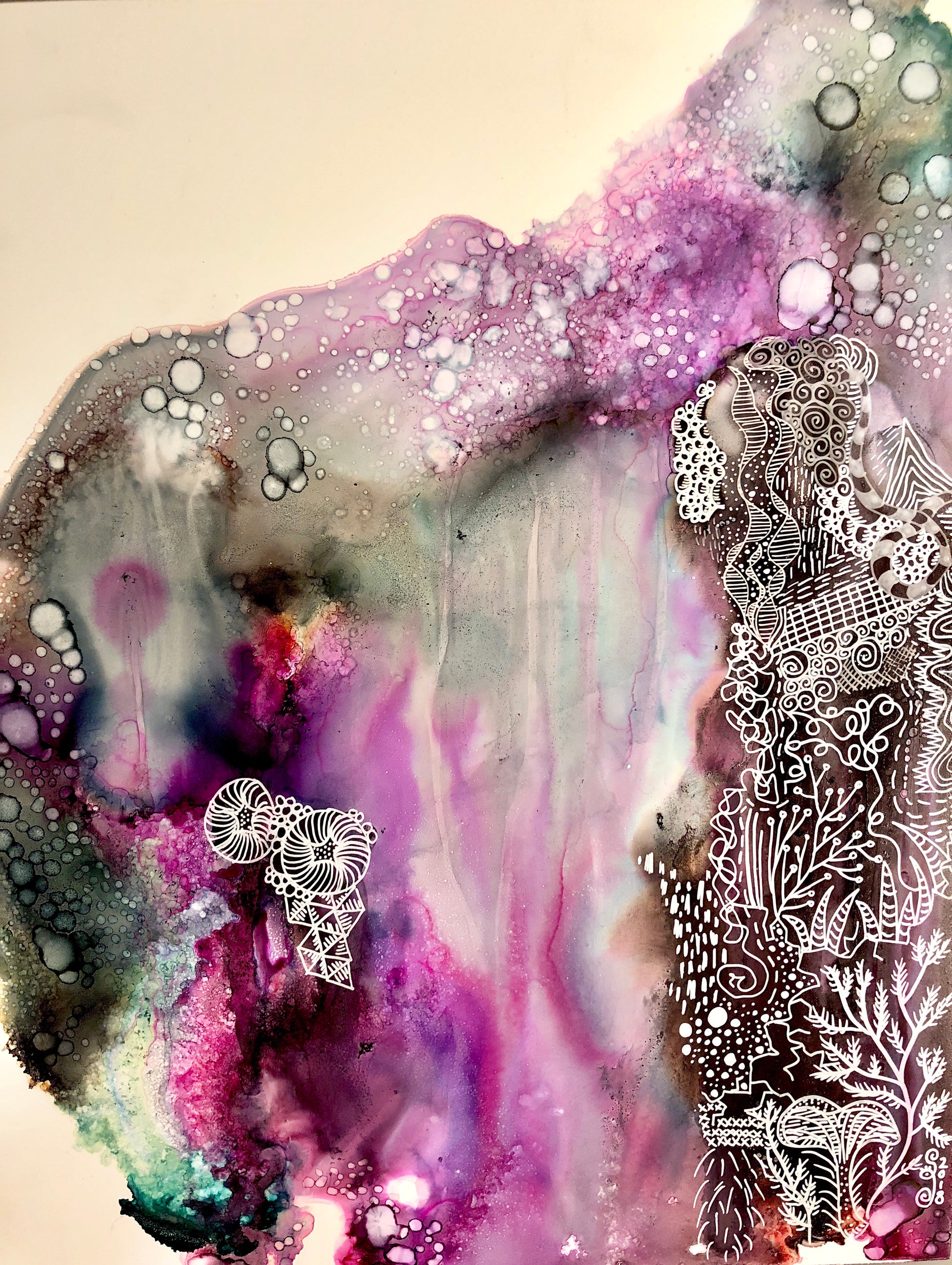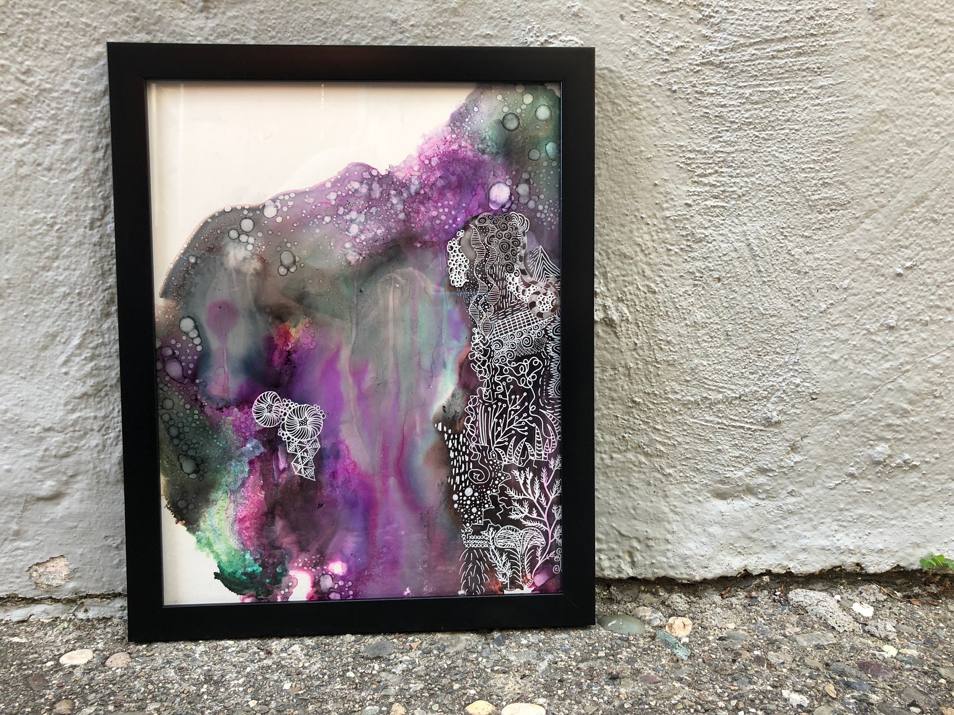 11” x 14” Framed piece of art done with alcohol inks and pen/ink on yupo paper.
